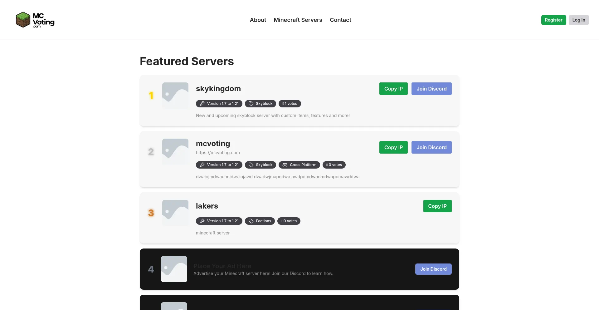 Vote for your favorite Minecraft servers! Discover the best Minecraft servers in 2025 and boost your community visibility on MCVoting.