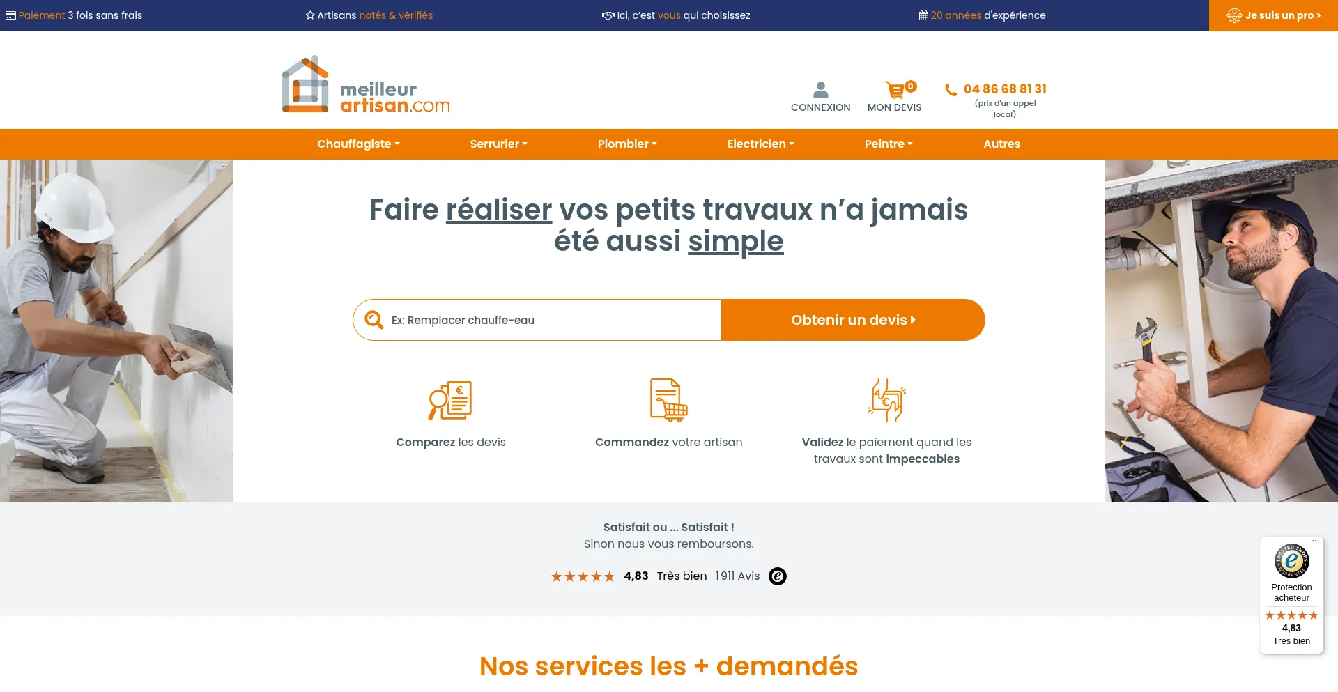 La place de marché de services avec prix fixés à l'avance, paiement après travaux et garantie de satisfaction. Trouvez l'artisan qualifié pour vos travaux.