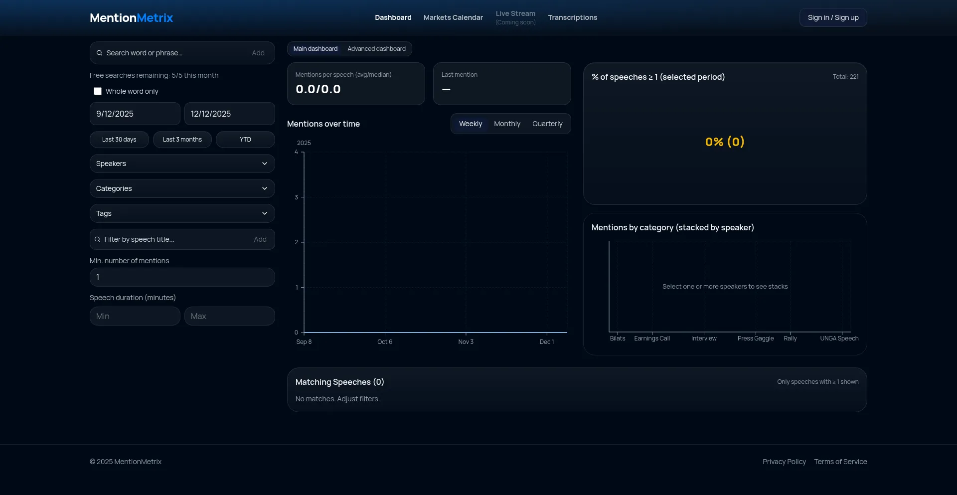 Track mentions and analyze trends across speeches to power your mention markets predictions. Don’t gamble—leverage data.