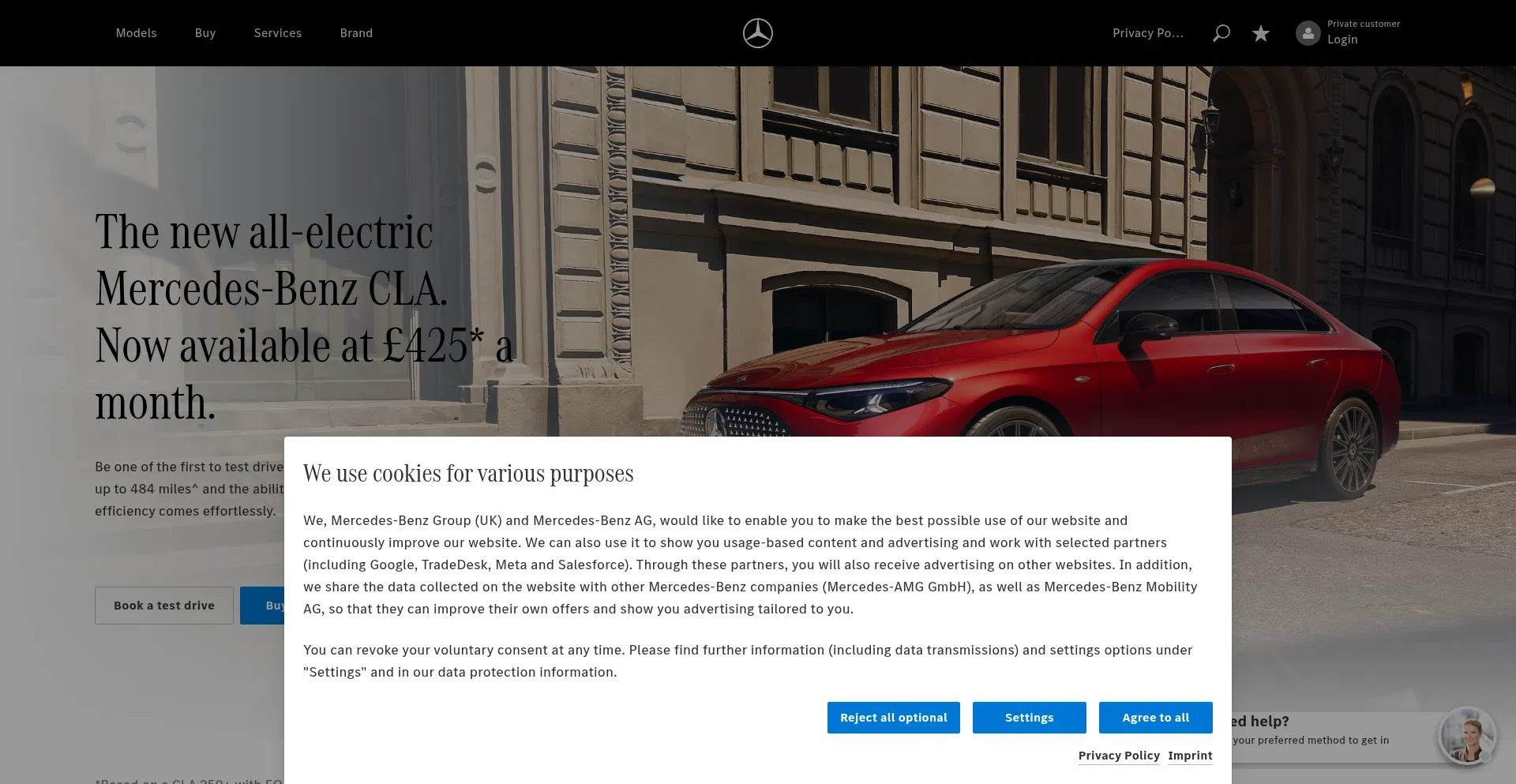 该网站实现符合GDPR或CCPA等隐私法规的cookie同意机制。这表明 mercedes-benz.co.uk 遵守数据保护标准并为用户提供对个人数据收集实践的控制。