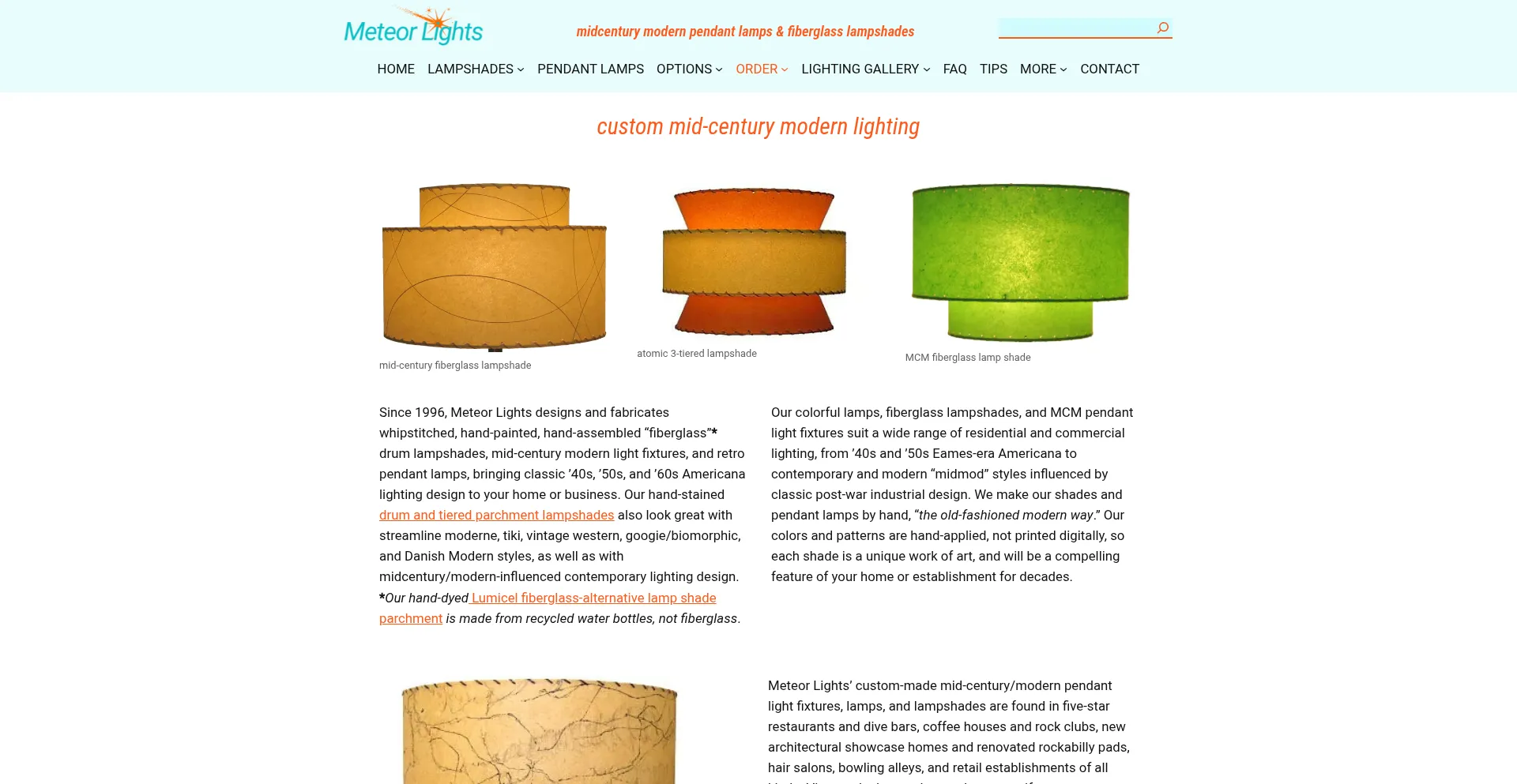 Design and fabrication of fiberglass drum & tiered lampshades, and mid-century modern pendant lamps & light fixtures, in classic 1950s MCM vintage styles.