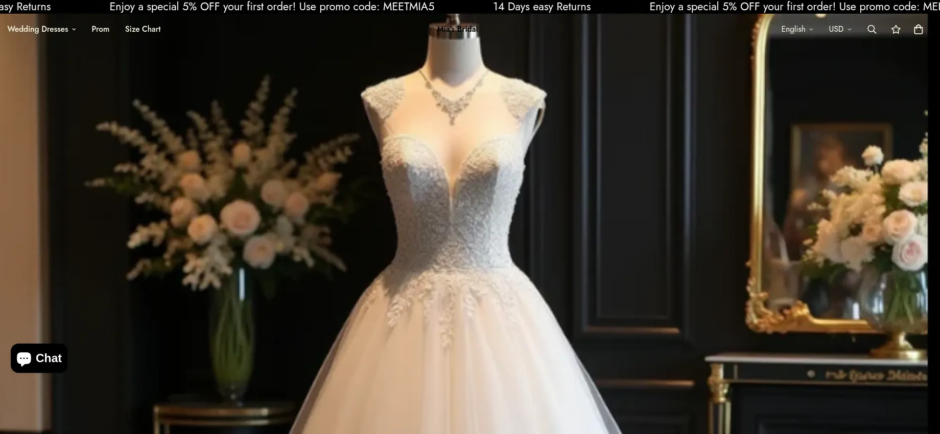 分析表明 miasbridal.com 作为电子商务平台运营,促进商品或服务的在线交易。该网站实现了购物车功能、支付处理系统和产品目录功能,这些是商业零售运营的典型特征。