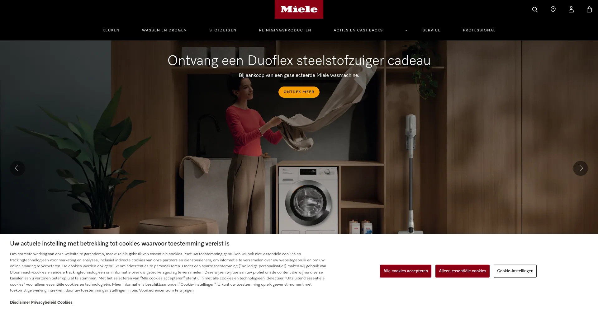 该网站实现符合GDPR或CCPA等隐私法规的cookie同意机制。这表明 miele.nl 遵守数据保护标准并为用户提供对个人数据收集实践的控制。