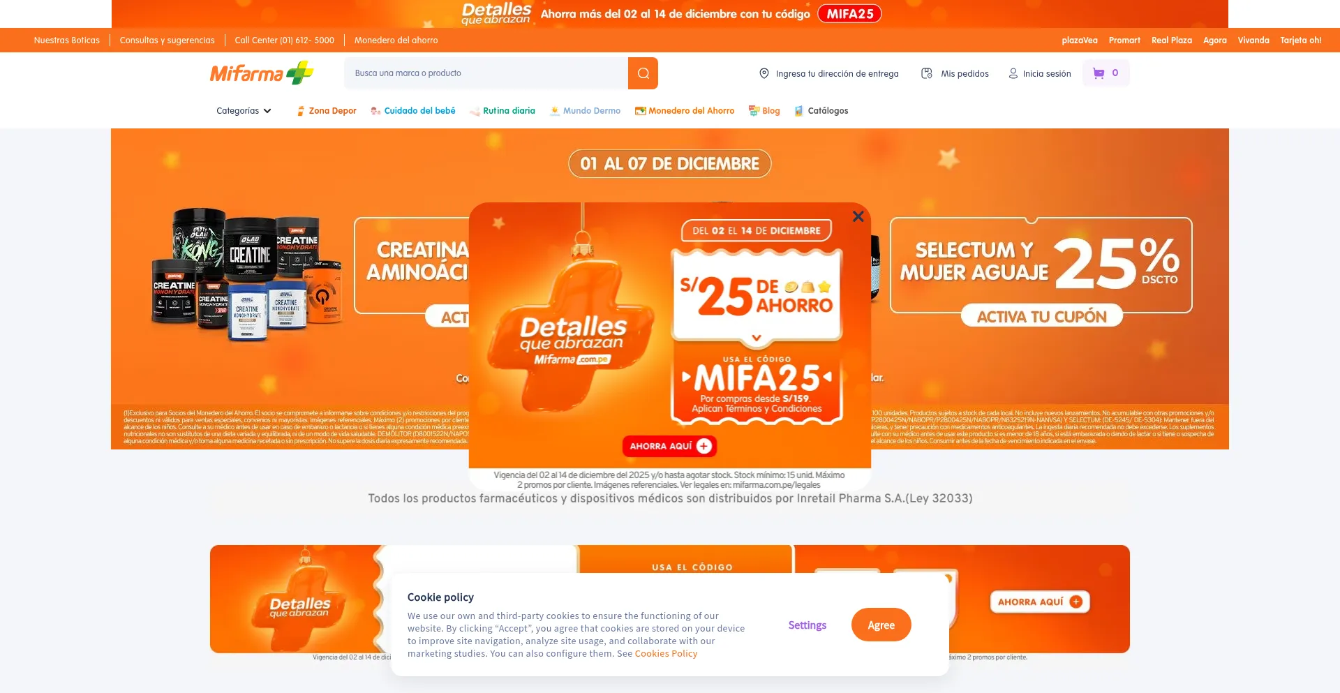 该网站实现符合GDPR或CCPA等隐私法规的cookie同意机制。这表明 mifarma.com.pe 遵守数据保护标准并为用户提供对个人数据收集实践的控制。