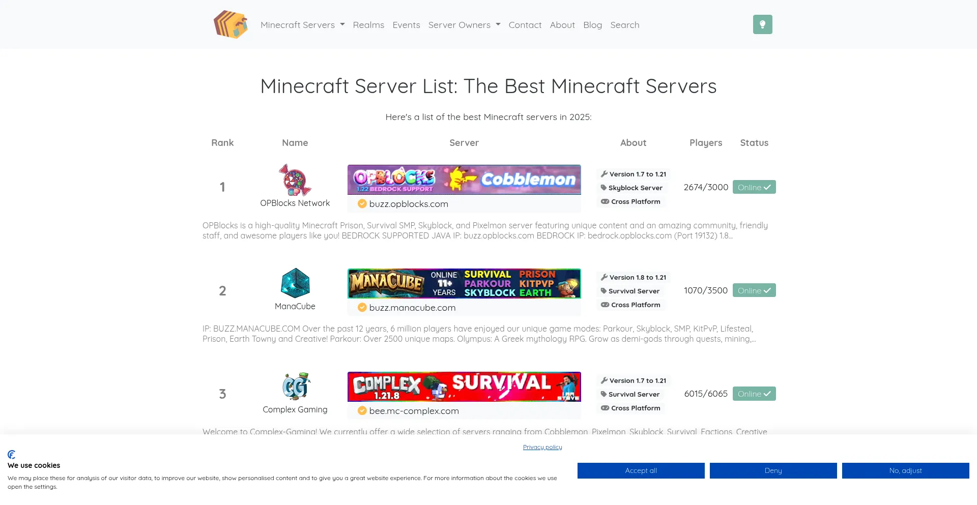 6,680+ Minecraft Servers with 215,000+ players online! Most Popular servers: Hypixel, Manacube, MC Central. The most up-to-date Minecraft Server List!