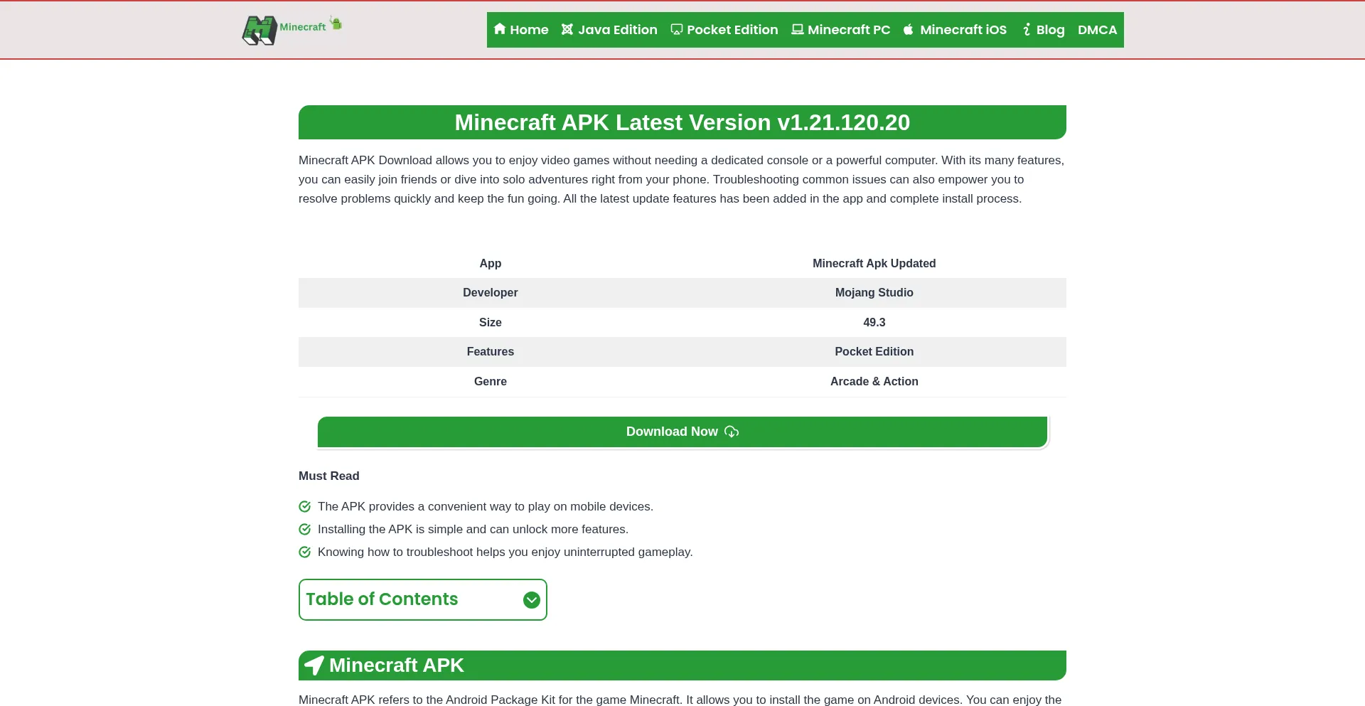 minecrftdownloads.com 提供 Android 设备移动应用程序,表明平台存在已扩展到网络服务之外。