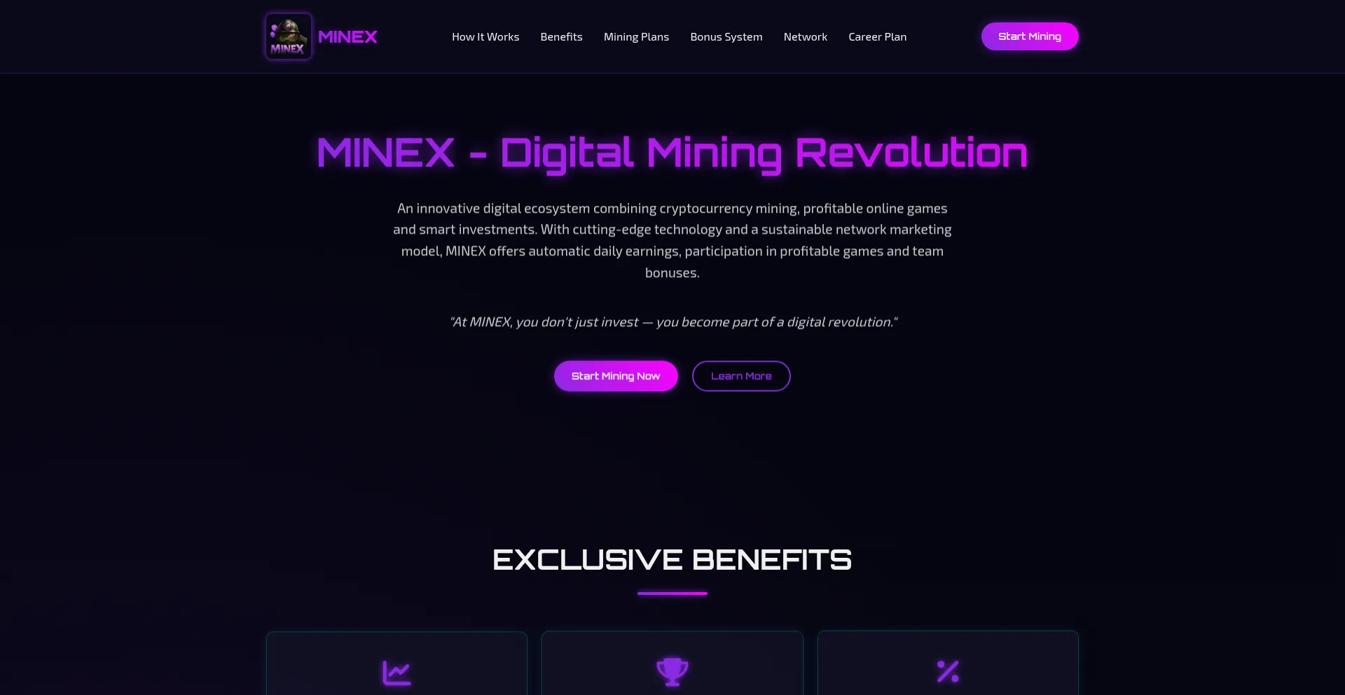 网站 minex.digital 可能提供云挖矿服务或加密货币挖矿投资。一些平台提供合法的挖矿租赁服务,而其他平台可能使用虚假的挖矿仪表板来显示无法提取的虚拟收益。