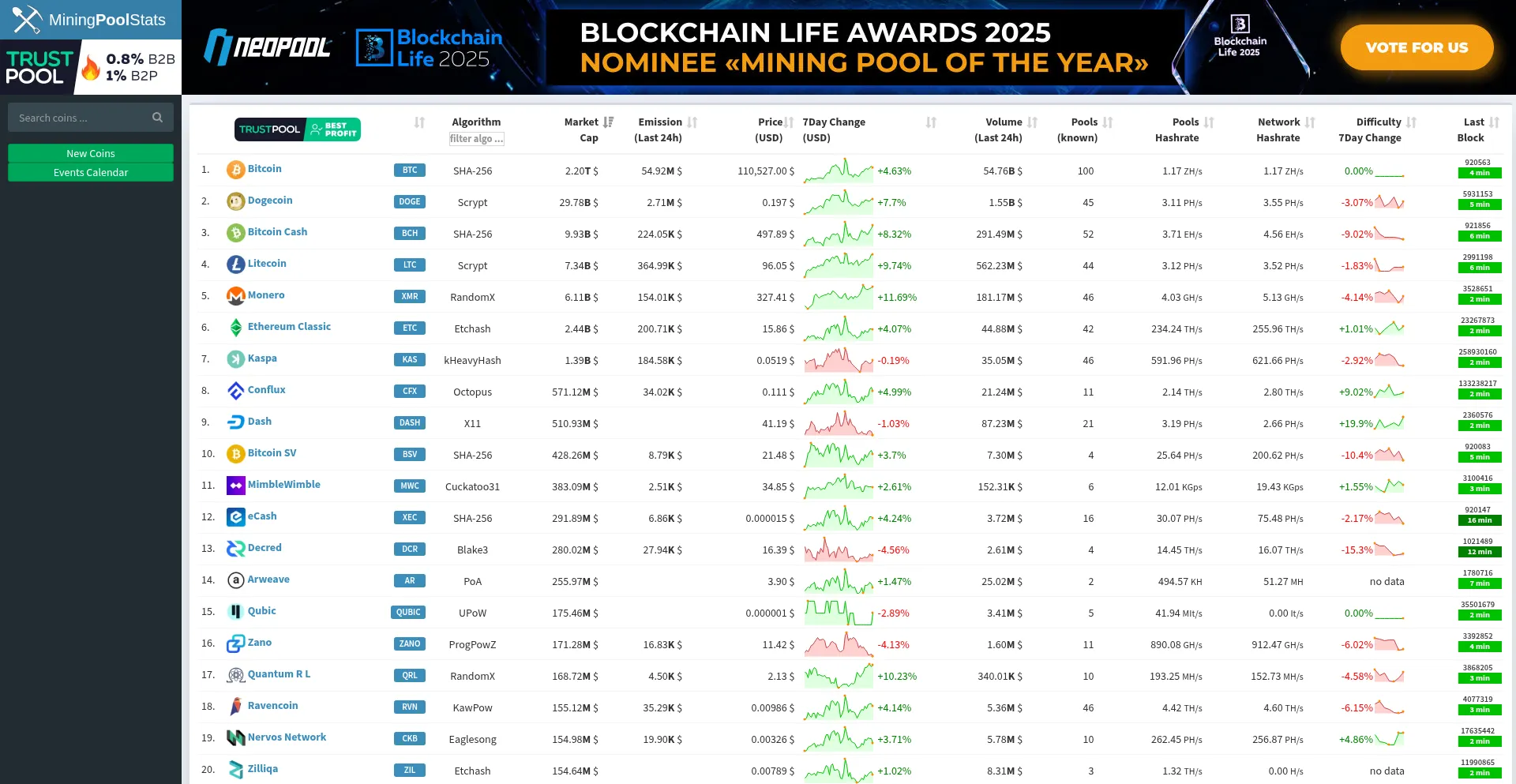 Mining Pool Stats | List of known PoW mining pools with realtime pool hashrate distribution. Pools & Block Explorer