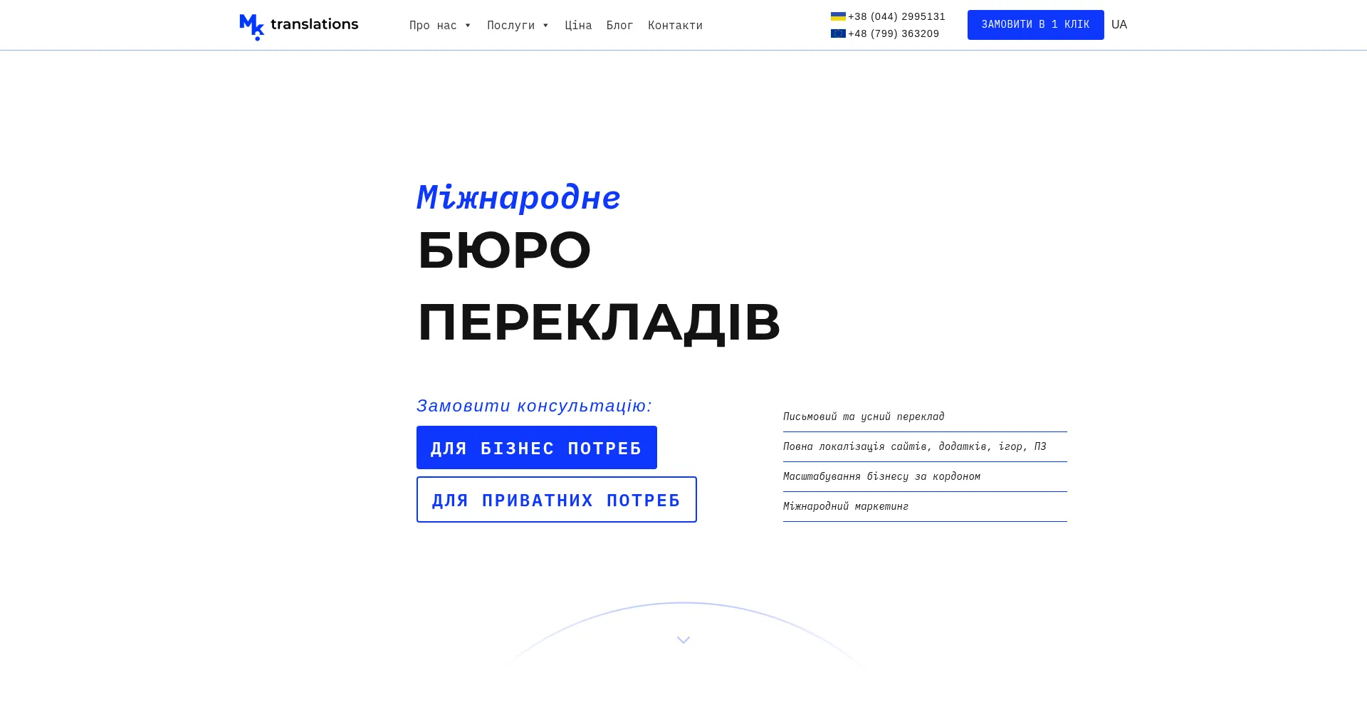 网站上存在社交媒体链接表明 mk-translations.ua 在社交媒体上维护官方账户,这是可信度和参与度的积极信号。