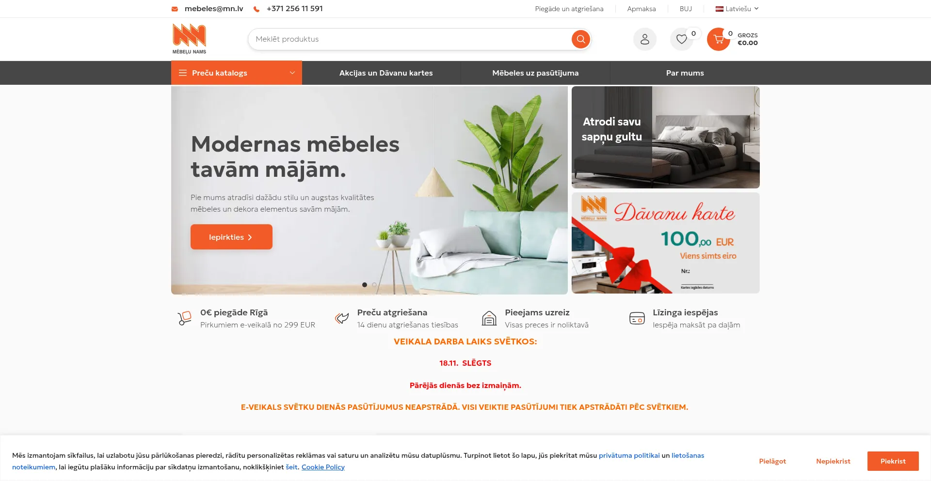 该网站实现符合GDPR或CCPA等隐私法规的cookie同意机制。这表明 mnmebeles.lv 遵守数据保护标准并为用户提供对个人数据收集实践的控制。