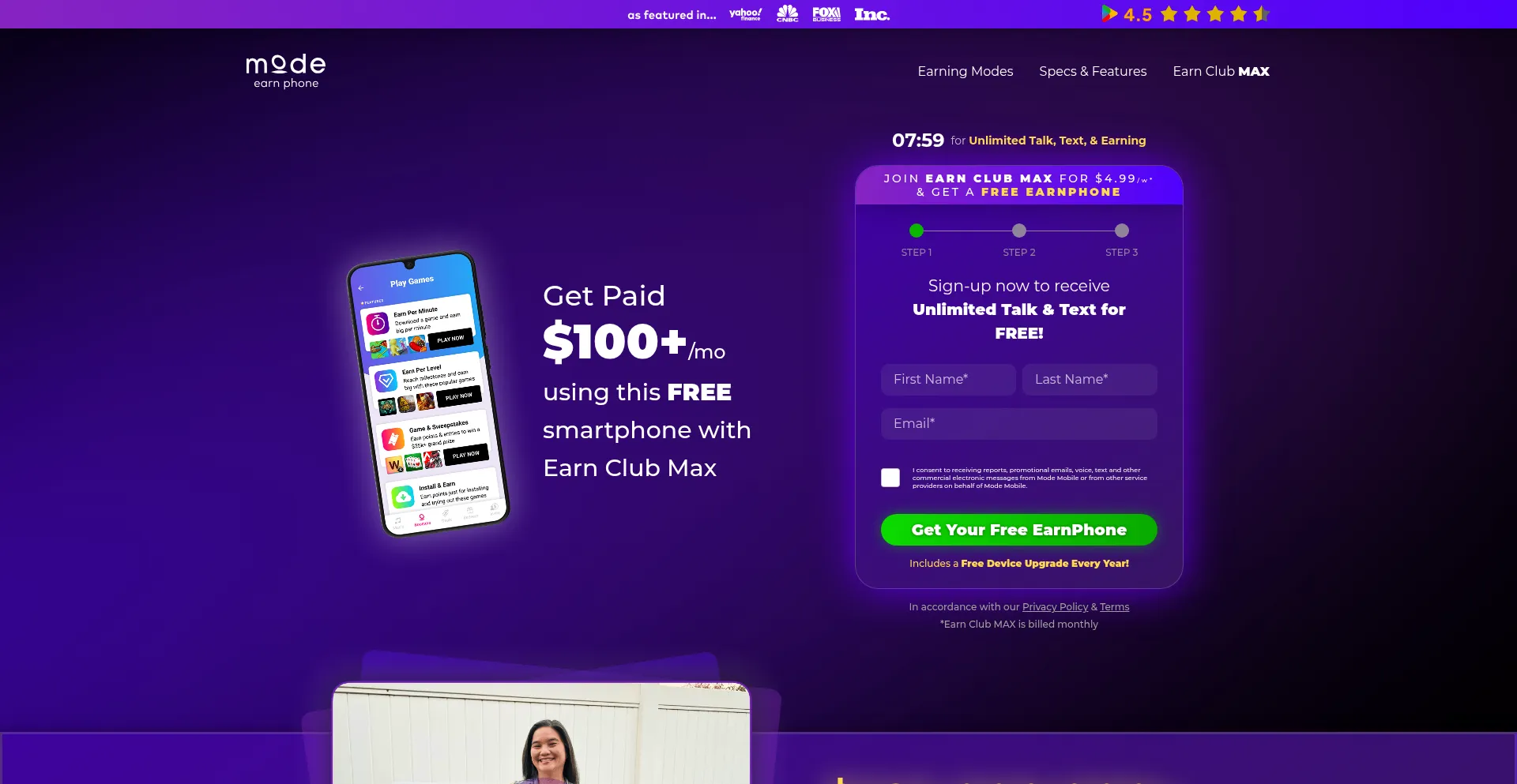 该网站实现数据收集表单,请求个人信息,包括姓名、电子邮件地址、电话号码或其他敏感详细信息。用户应验证 modephone.com 的合法性并在提交个人数据前查看隐私政策。