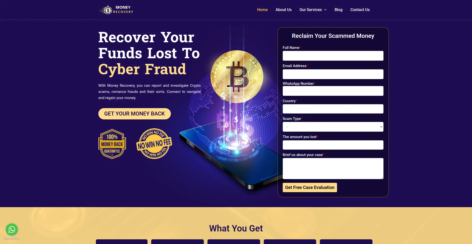 该网站实现数据收集表单,请求个人信息,包括姓名、电子邮件地址、电话号码或其他敏感详细信息。用户应验证 moneyrecovery.top 的合法性并在提交个人数据前查看隐私政策。