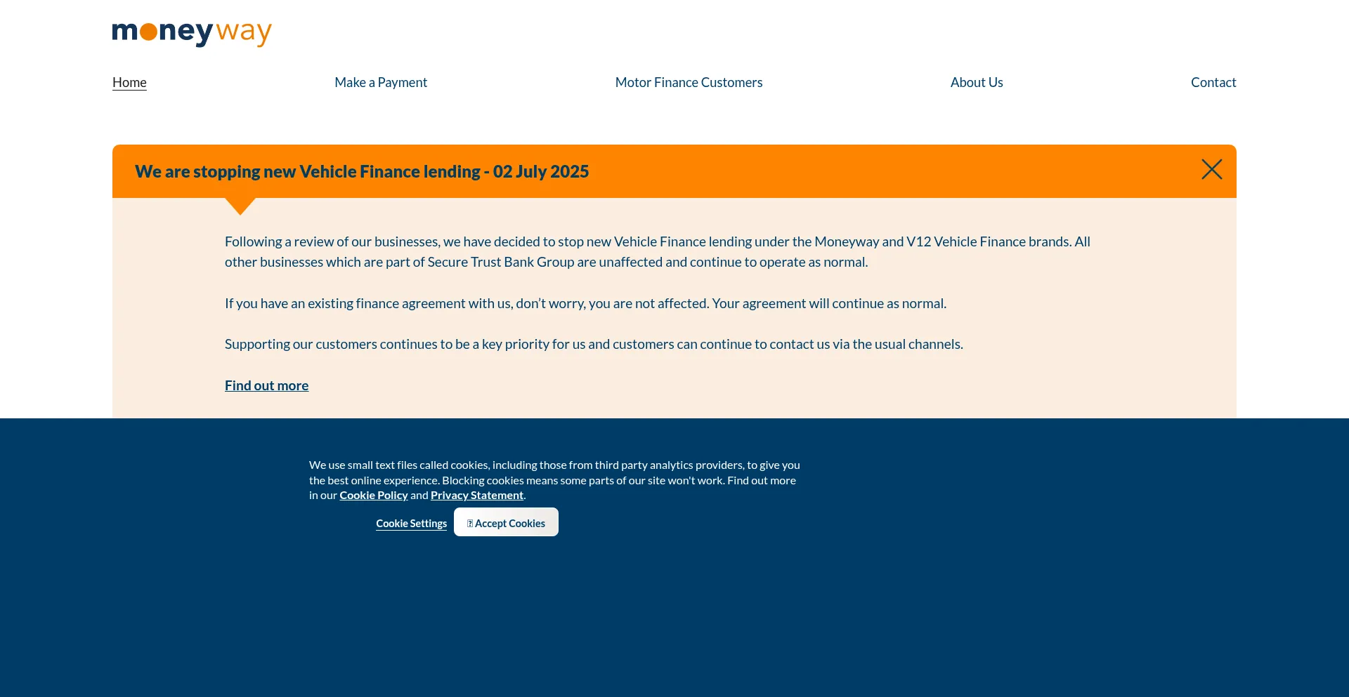 该网站实现符合GDPR或CCPA等隐私法规的cookie同意机制。这表明 moneyway.co.uk 遵守数据保护标准并为用户提供对个人数据收集实践的控制。