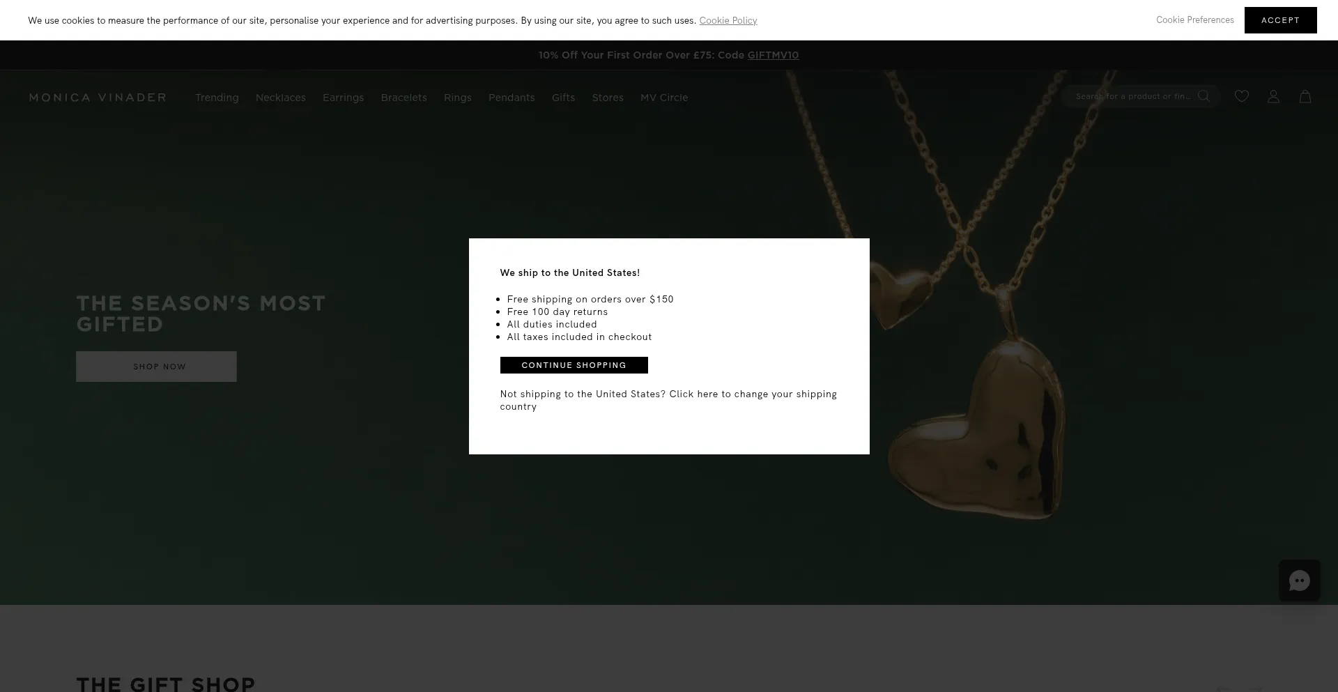 该网站实现符合GDPR或CCPA等隐私法规的cookie同意机制。这表明 monicavinader.com 遵守数据保护标准并为用户提供对个人数据收集实践的控制。