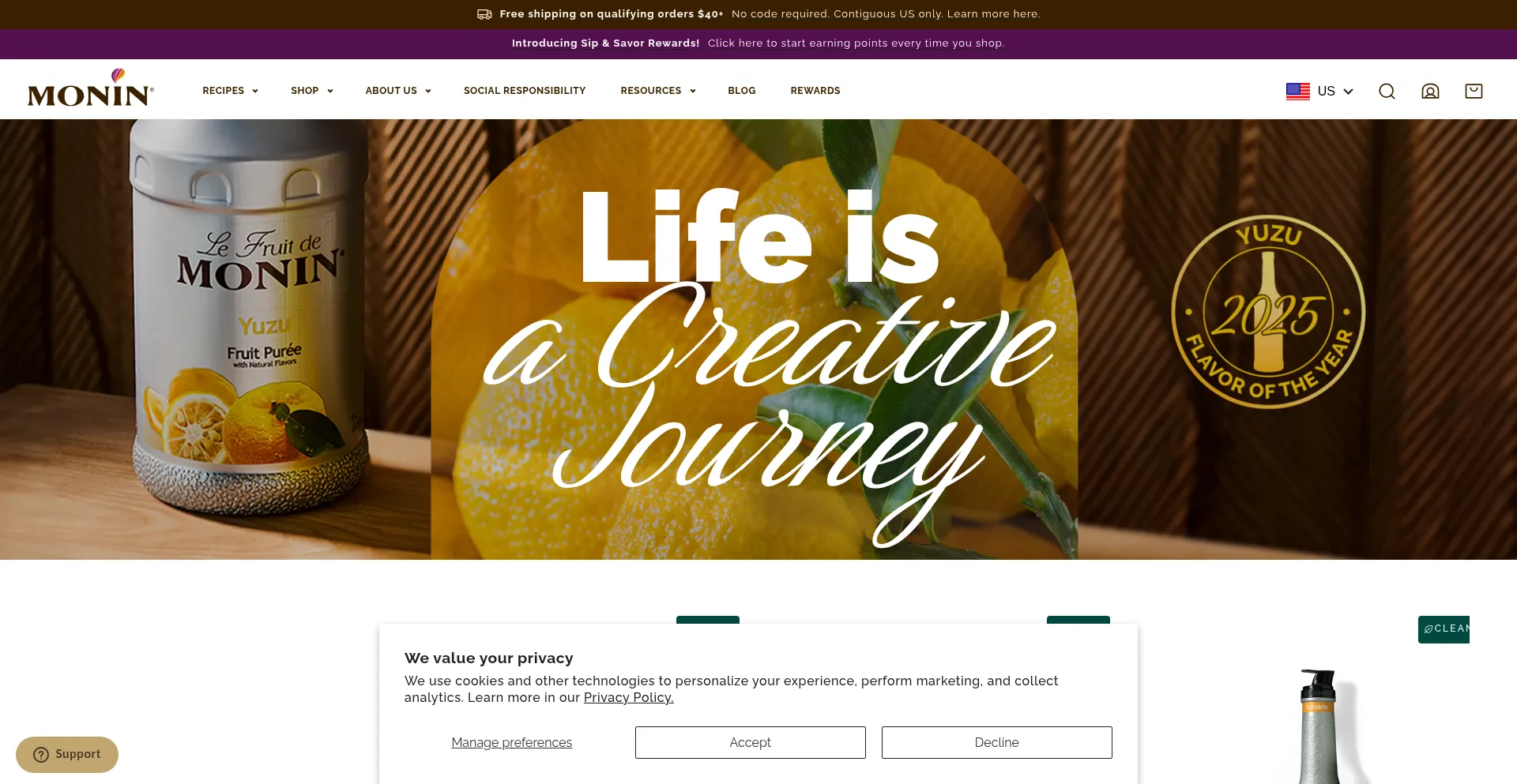 该网站实现符合GDPR或CCPA等隐私法规的cookie同意机制。这表明 monin.us.com 遵守数据保护标准并为用户提供对个人数据收集实践的控制。