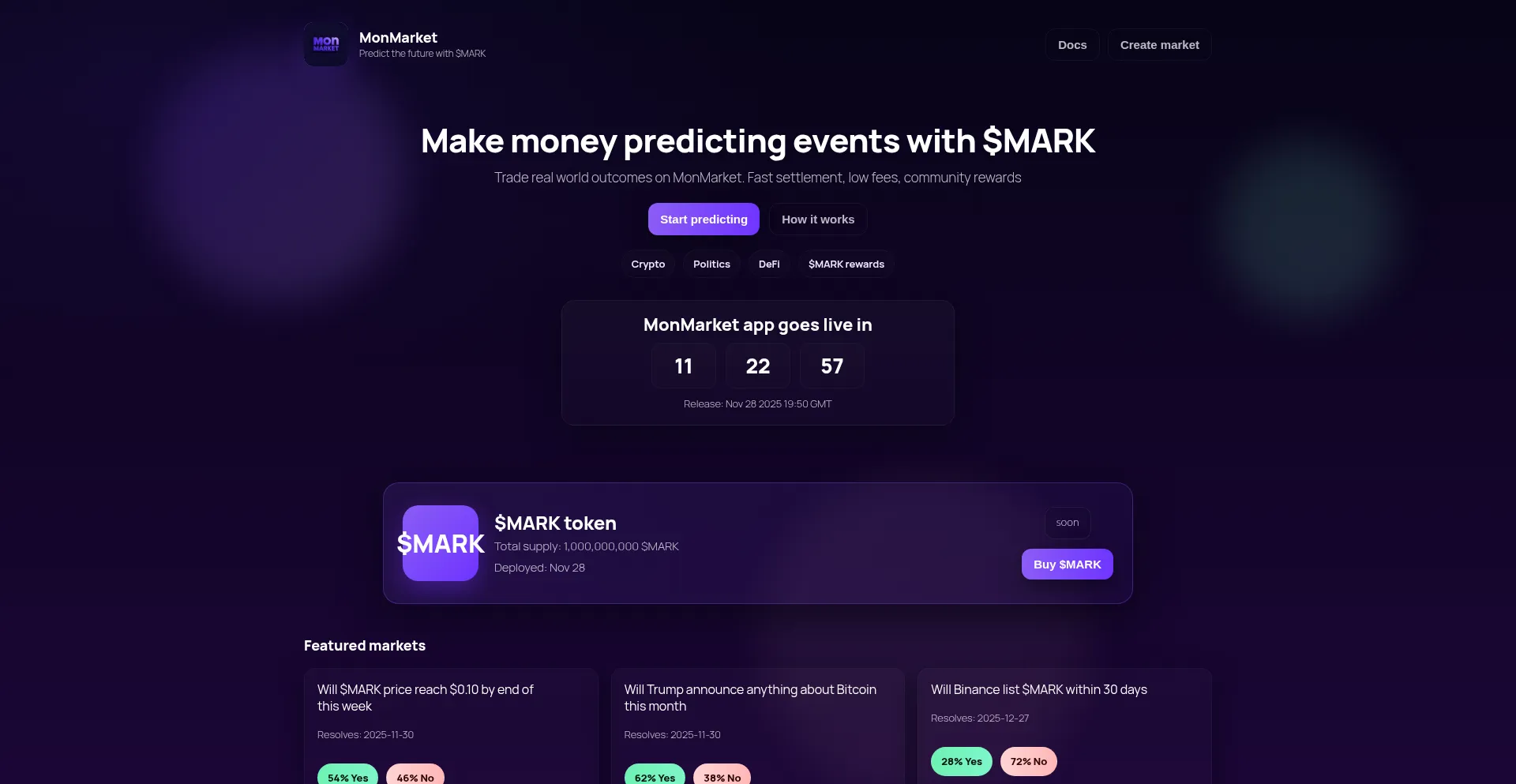 MonMarket prediction markets on Solana. Trade $MARK, create markets, win rewards.