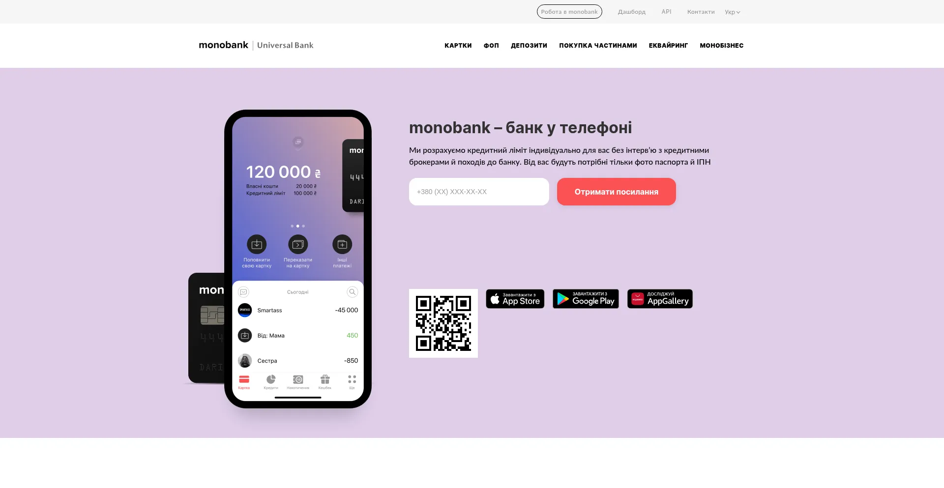 该网站实现数据收集表单,请求个人信息,包括姓名、电子邮件地址、电话号码或其他敏感详细信息。用户应验证 monobank.ua 的合法性并在提交个人数据前查看隐私政策。