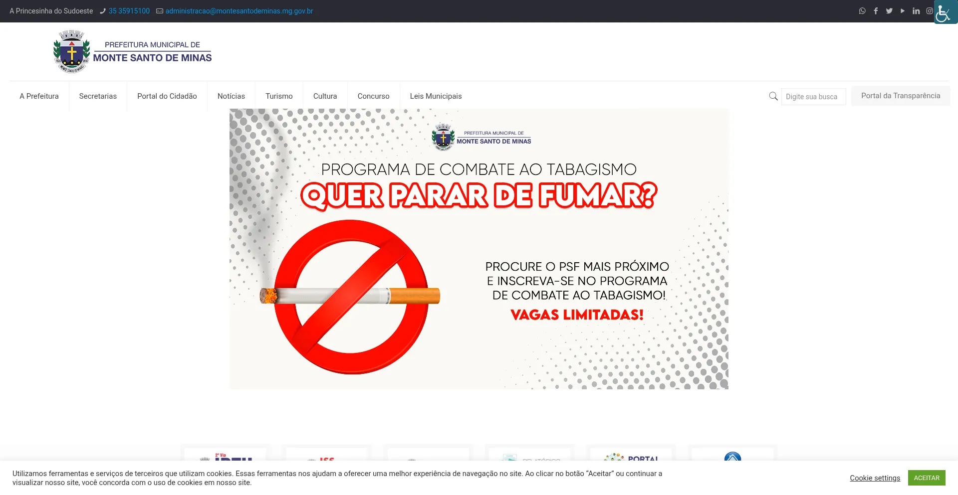 网站上存在社交媒体链接表明 montesantodeminas.mg.gov.br 在社交媒体上维护官方账户,这是可信度和参与度的积极信号。
