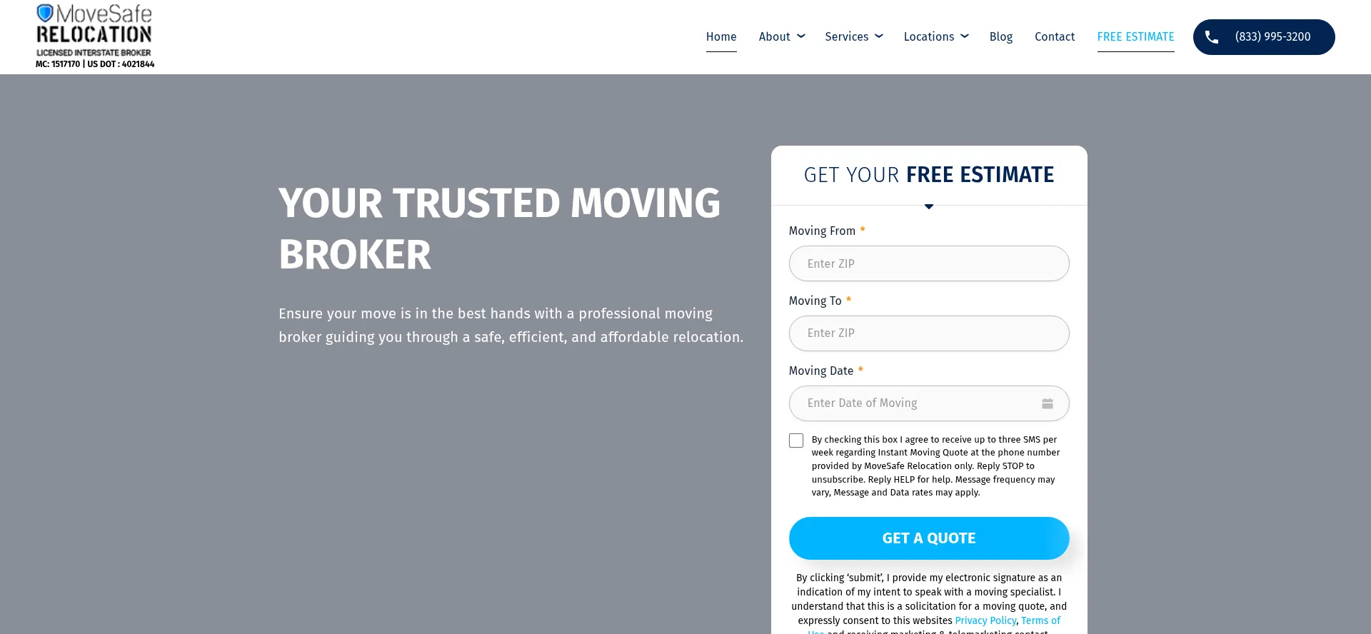 该网站实现数据收集表单,请求个人信息,包括姓名、电子邮件地址、电话号码或其他敏感详细信息。用户应验证 movesaferelocation.com 的合法性并在提交个人数据前查看隐私政策。