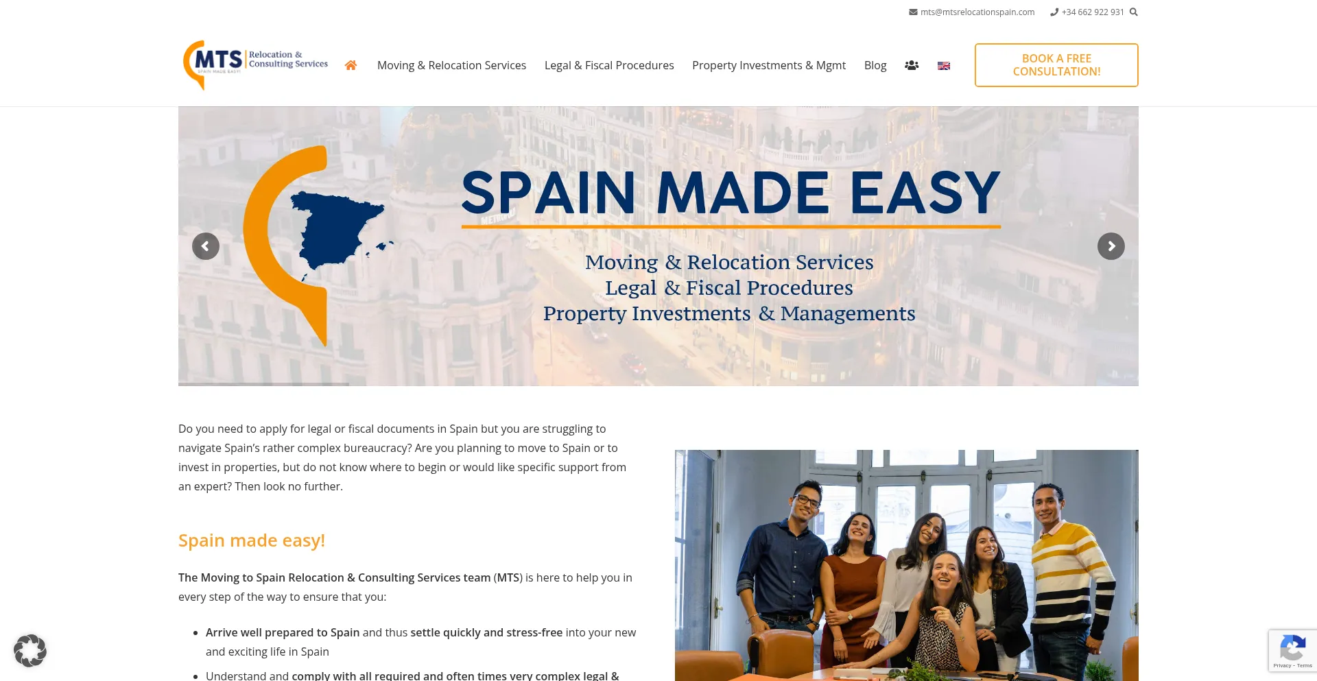 该网站实现数据收集表单,请求个人信息,包括姓名、电子邮件地址、电话号码或其他敏感详细信息。用户应验证 mtsrelocationspain.com 的合法性并在提交个人数据前查看隐私政策。