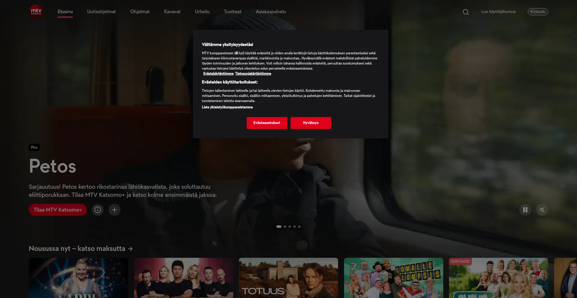 该网站实现符合GDPR或CCPA等隐私法规的cookie同意机制。这表明 mtv.fi 遵守数据保护标准并为用户提供对个人数据收集实践的控制。