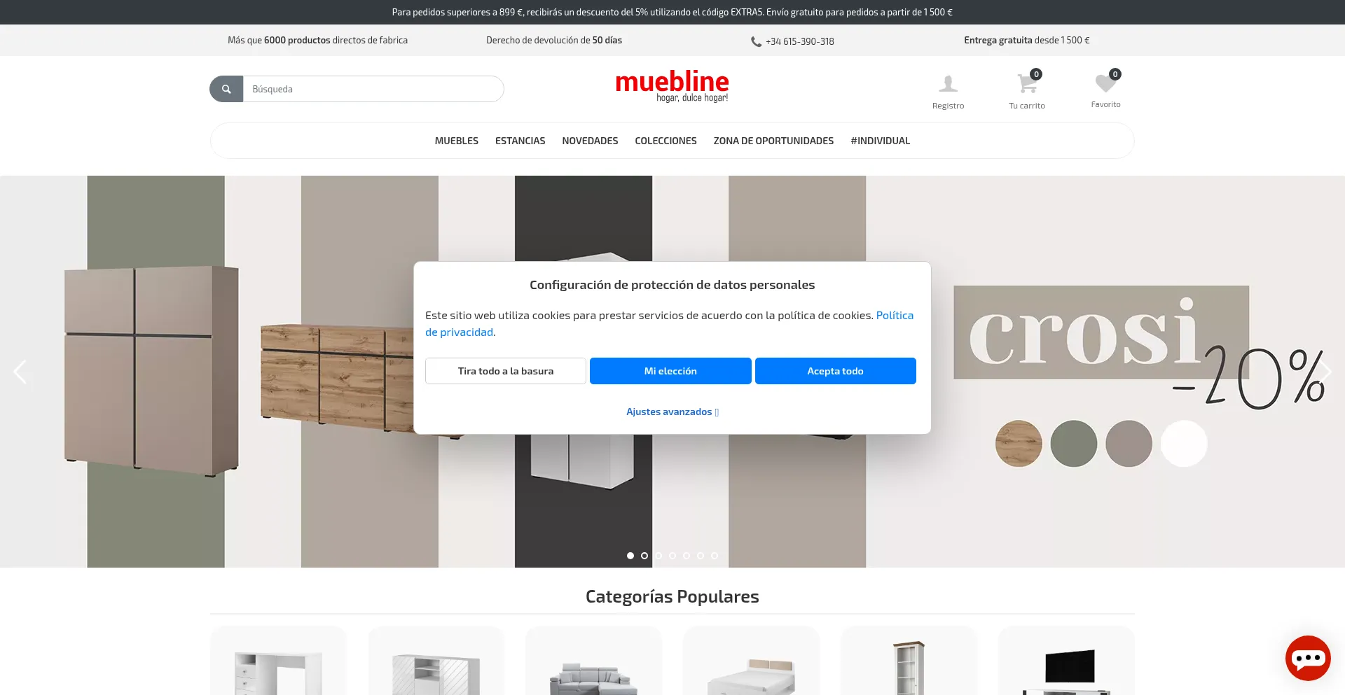 该网站实现符合GDPR或CCPA等隐私法规的cookie同意机制。这表明 muebline.es 遵守数据保护标准并为用户提供对个人数据收集实践的控制。