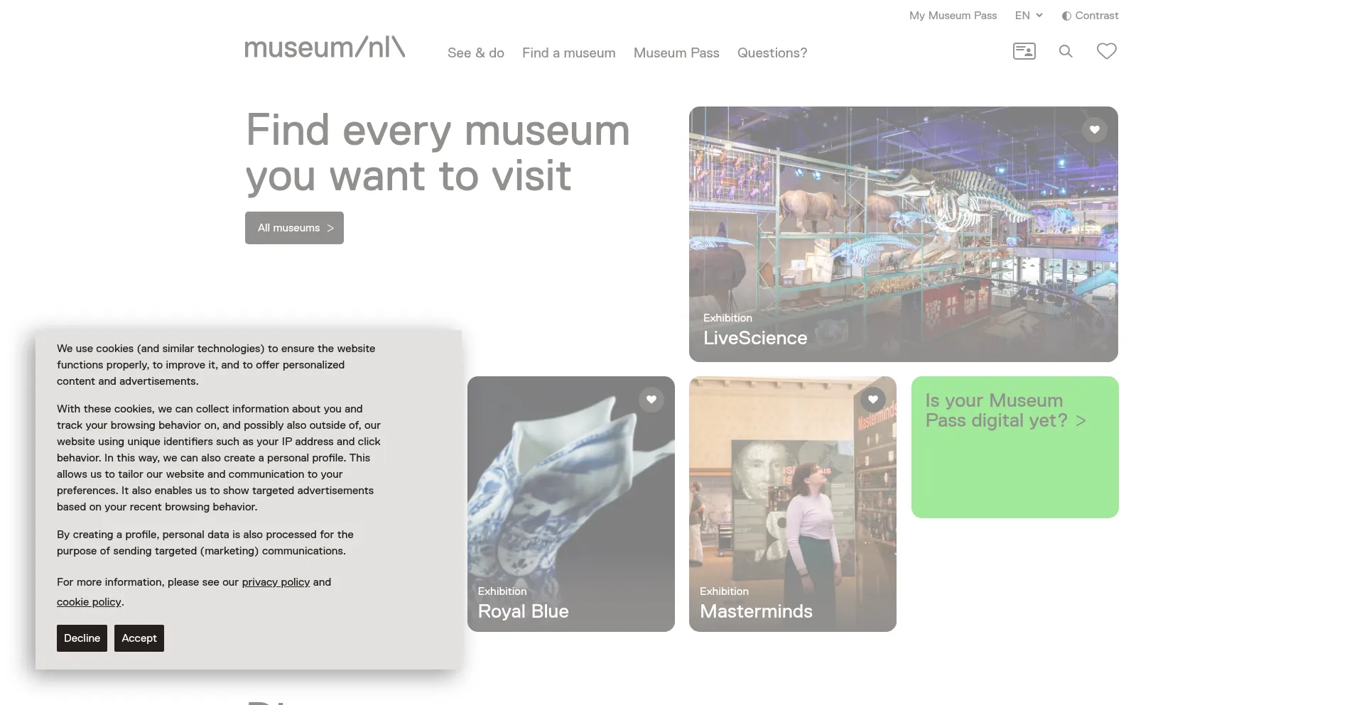 该网站实现符合GDPR或CCPA等隐私法规的cookie同意机制。这表明 museum.nl 遵守数据保护标准并为用户提供对个人数据收集实践的控制。