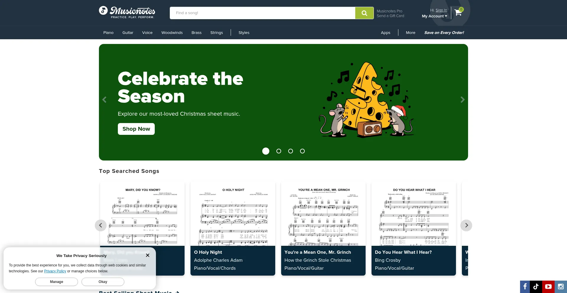 网站上存在社交媒体链接表明 musicnotes.com 在社交媒体上维护官方账户,这是可信度和参与度的积极信号。