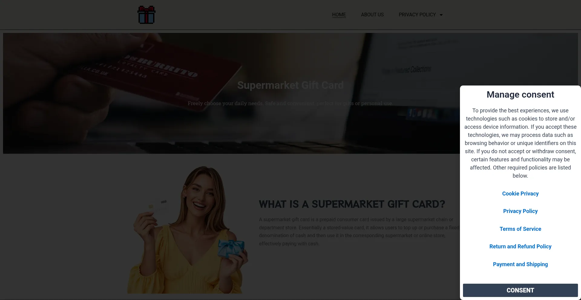 A supermarket gift card is a prepaid consumer card issued by a large supermarket chain or department store.