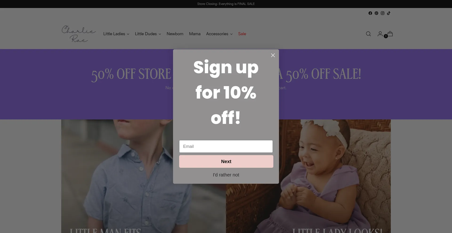 Charlie Rae children's clothing boutique for boys and girls tops, bottoms, one pieces, dresses, and accessories for baby and mom and dad.