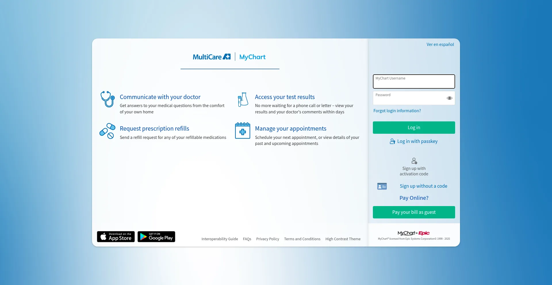 mychart.multicare.org 提供 Android 设备移动应用程序,表明平台存在已扩展到网络服务之外。