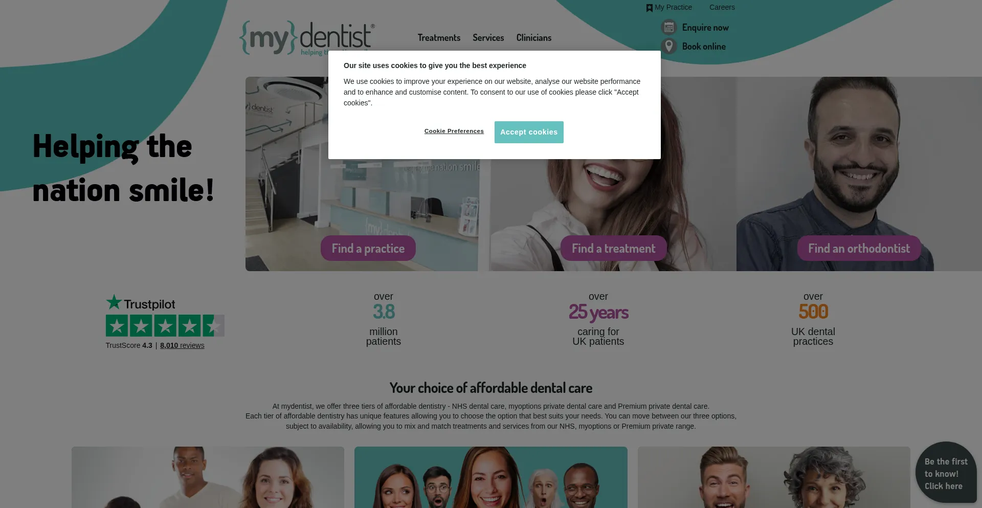 该网站实现符合GDPR或CCPA等隐私法规的cookie同意机制。这表明 mydentist.co.uk 遵守数据保护标准并为用户提供对个人数据收集实践的控制。