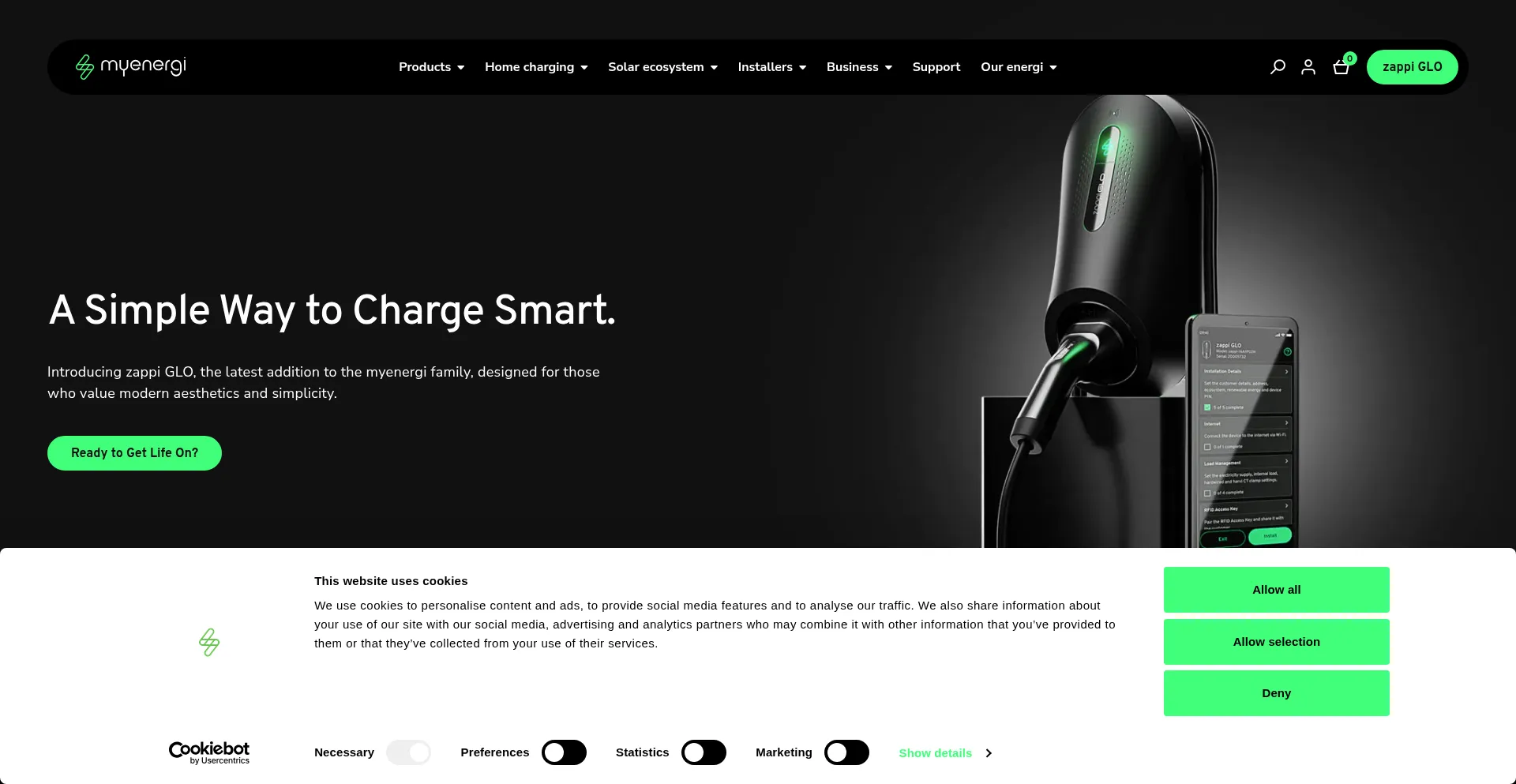 该网站实现符合GDPR或CCPA等隐私法规的cookie同意机制。这表明 myenergi.com 遵守数据保护标准并为用户提供对个人数据收集实践的控制。