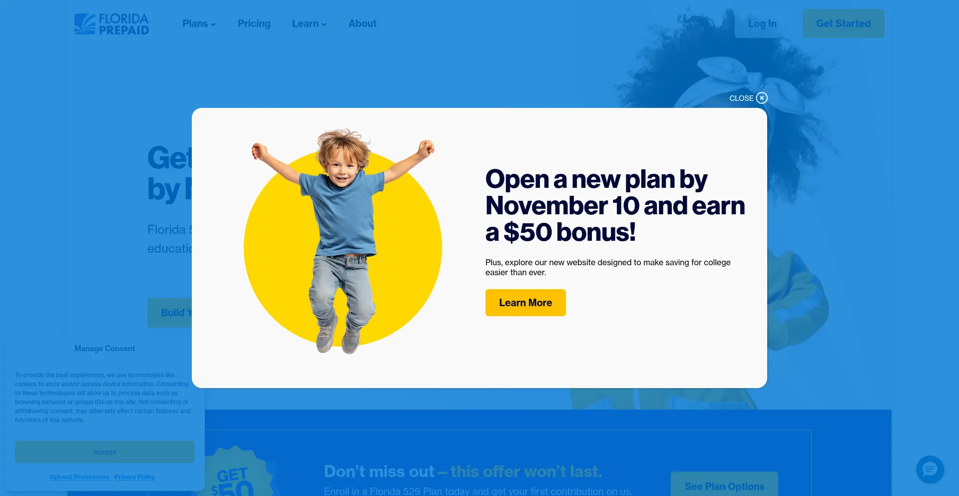 该网站实现符合GDPR或CCPA等隐私法规的cookie同意机制。这表明 myfloridaprepaid.com 遵守数据保护标准并为用户提供对个人数据收集实践的控制。