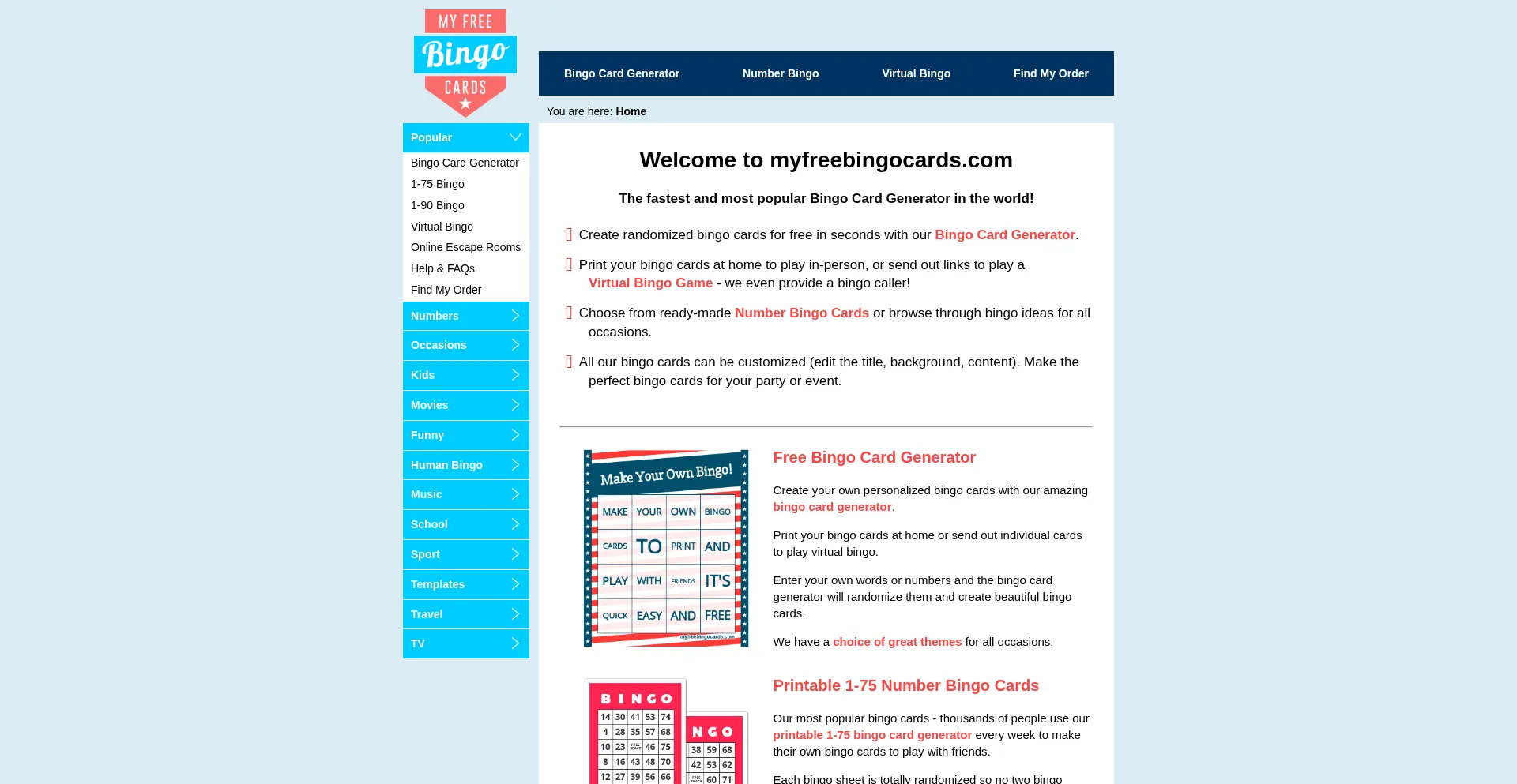 Free printable bingo card generator and virtual bingo games. We have 1-75 number bingo and bingo cards for all seasons and occasions to print or play online.