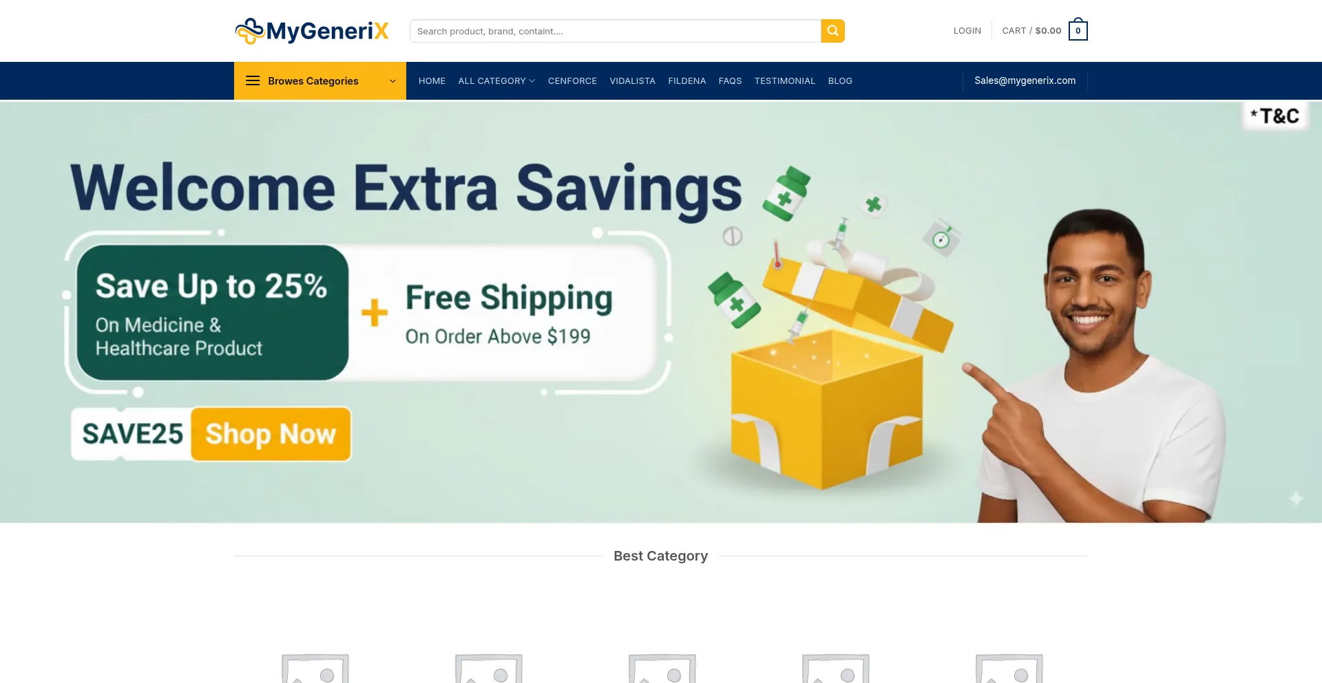 分析表明 mygenerix.com 作为电子商务平台运营,促进商品或服务的在线交易。该网站实现了购物车功能、支付处理系统和产品目录功能,这些是商业零售运营的典型特征。