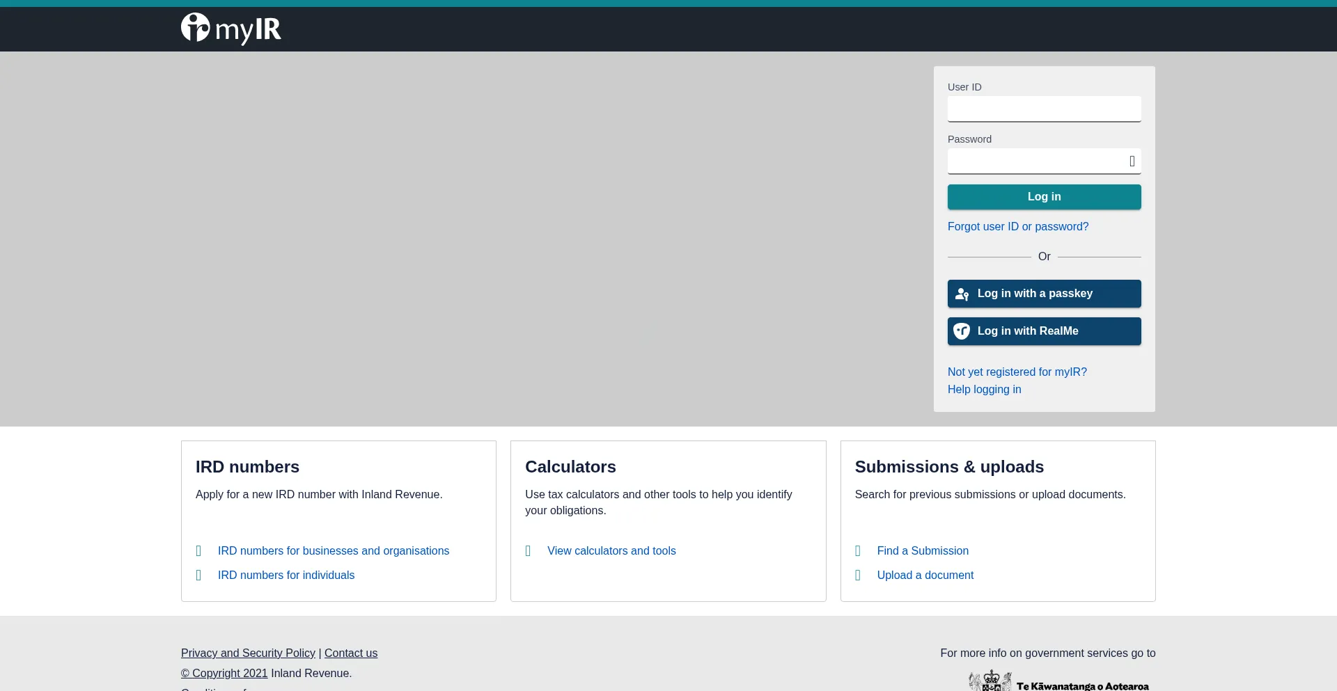 该网站实现数据收集表单,请求个人信息,包括姓名、电子邮件地址、电话号码或其他敏感详细信息。用户应验证 myir.ird.govt.nz 的合法性并在提交个人数据前查看隐私政策。
