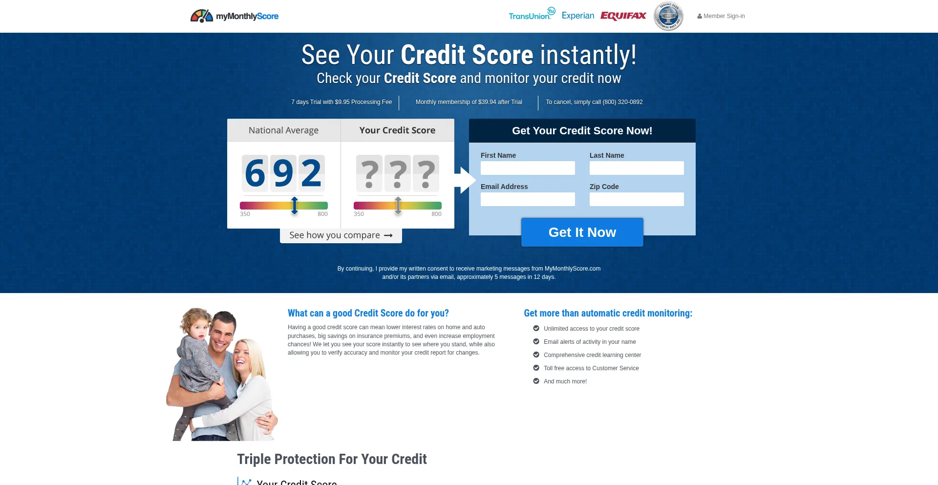 该网站实现数据收集表单,请求个人信息,包括姓名、电子邮件地址、电话号码或其他敏感详细信息。用户应验证 mymonthlyscore.com 的合法性并在提交个人数据前查看隐私政策。