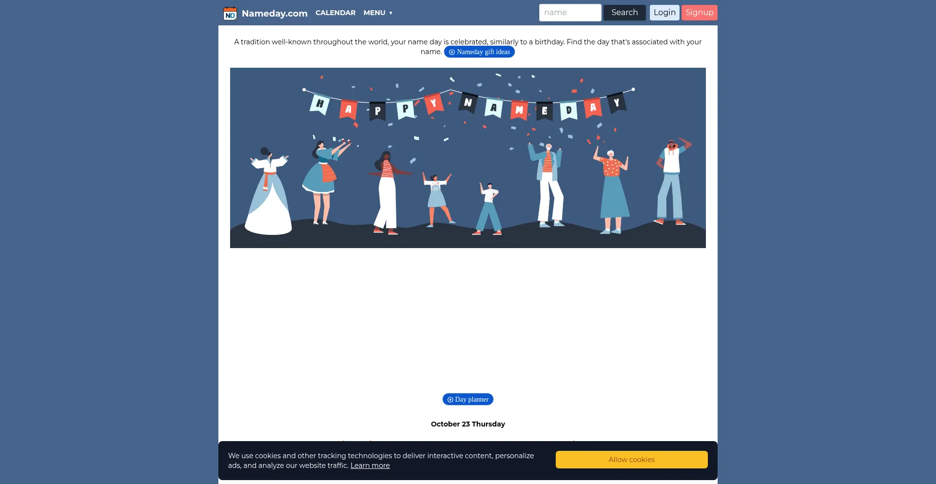 该网站实现符合GDPR或CCPA等隐私法规的cookie同意机制。这表明 nameday.com 遵守数据保护标准并为用户提供对个人数据收集实践的控制。