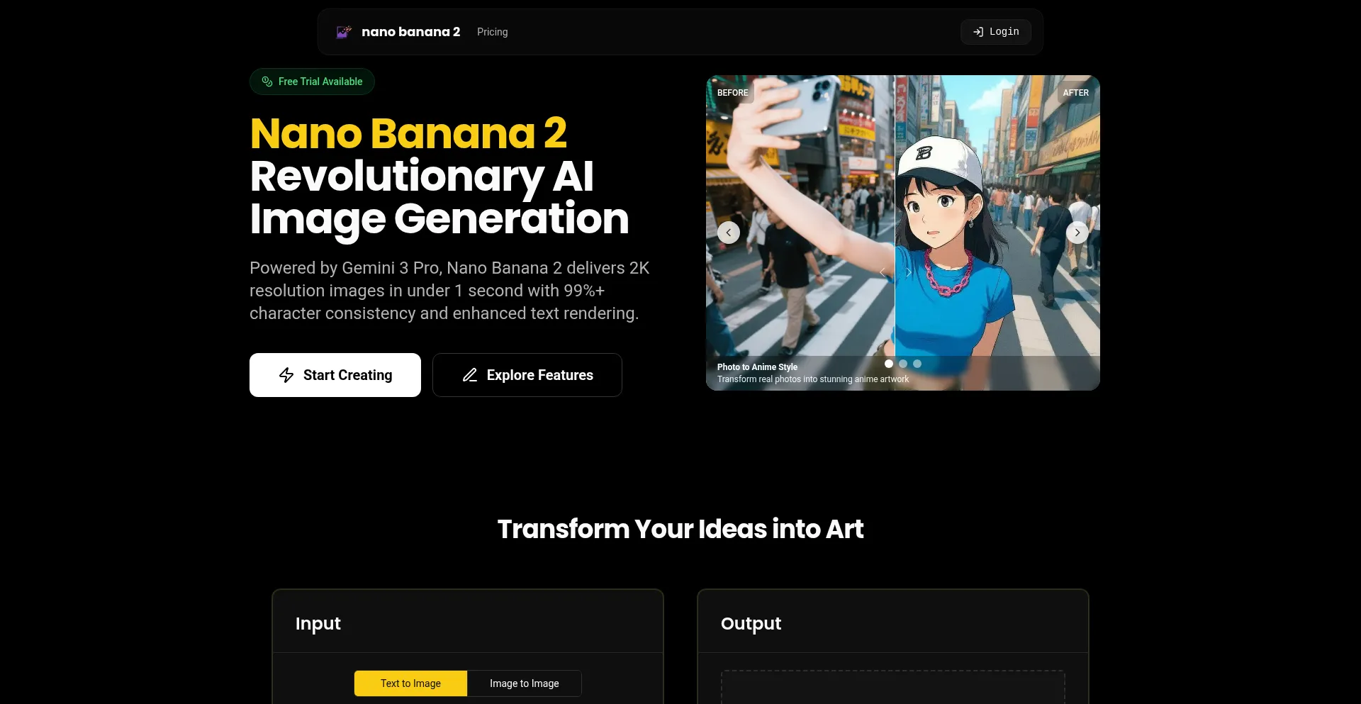 AI image generation platform powered by Nano Banana 2(GEMPIX-2). Transform photos, apply styles, and restoration—fast and easy.