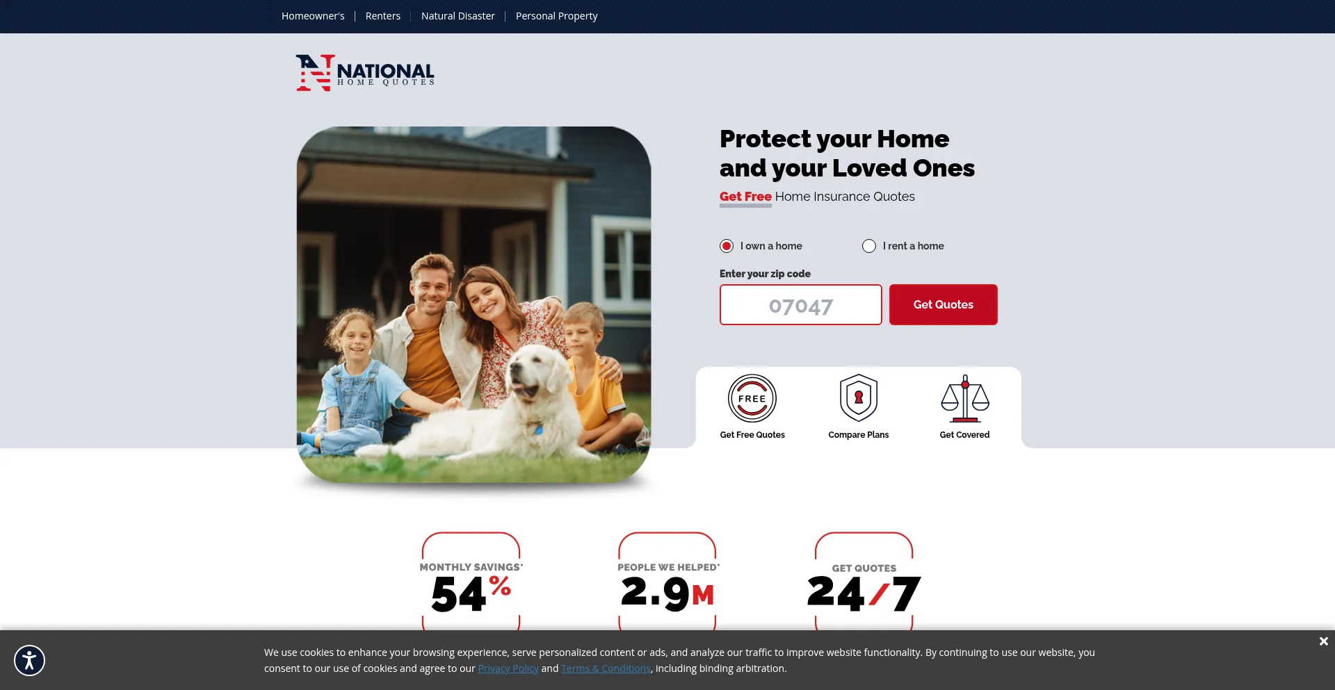 该网站实现符合GDPR或CCPA等隐私法规的cookie同意机制。这表明 nationalhomequotes.com 遵守数据保护标准并为用户提供对个人数据收集实践的控制。