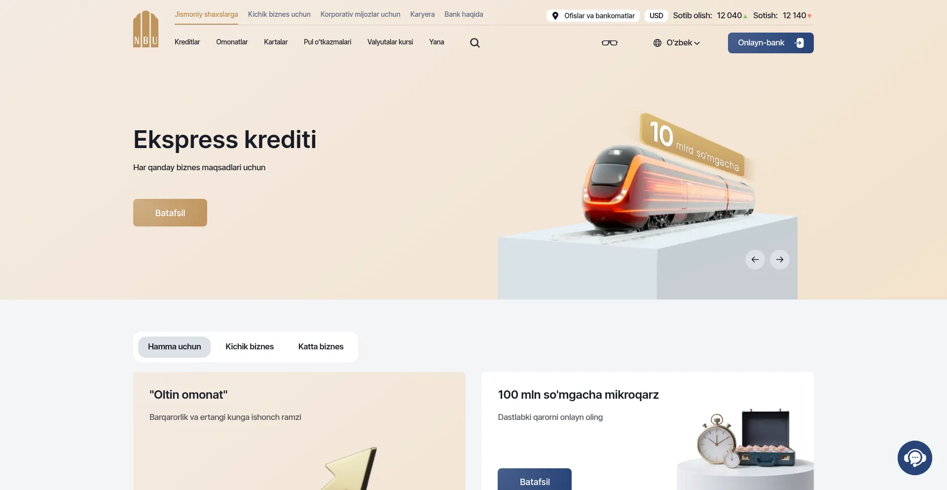 NBU jismoniy shaxslar, kichik biznes va korporativ mijozlar uchun kreditlar, omonatlar, kartalar va pul oʻtkazmalarini oʻz ichiga olgan keng koʻlamli xizmatlarni taklif etadi...