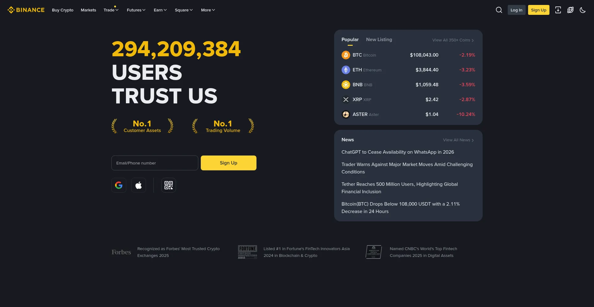 Binance, the largest crypto exchange by trading volume, serves 250M+ users in 180+ countries. With 350+ listed altcoins, it is the world's leading crypto exchange.