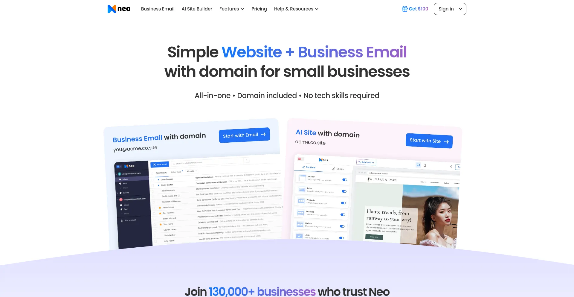 Neo is an all-in-one platform where small businesses can create business email with domain and AI website and grow with built-in marketing tools.