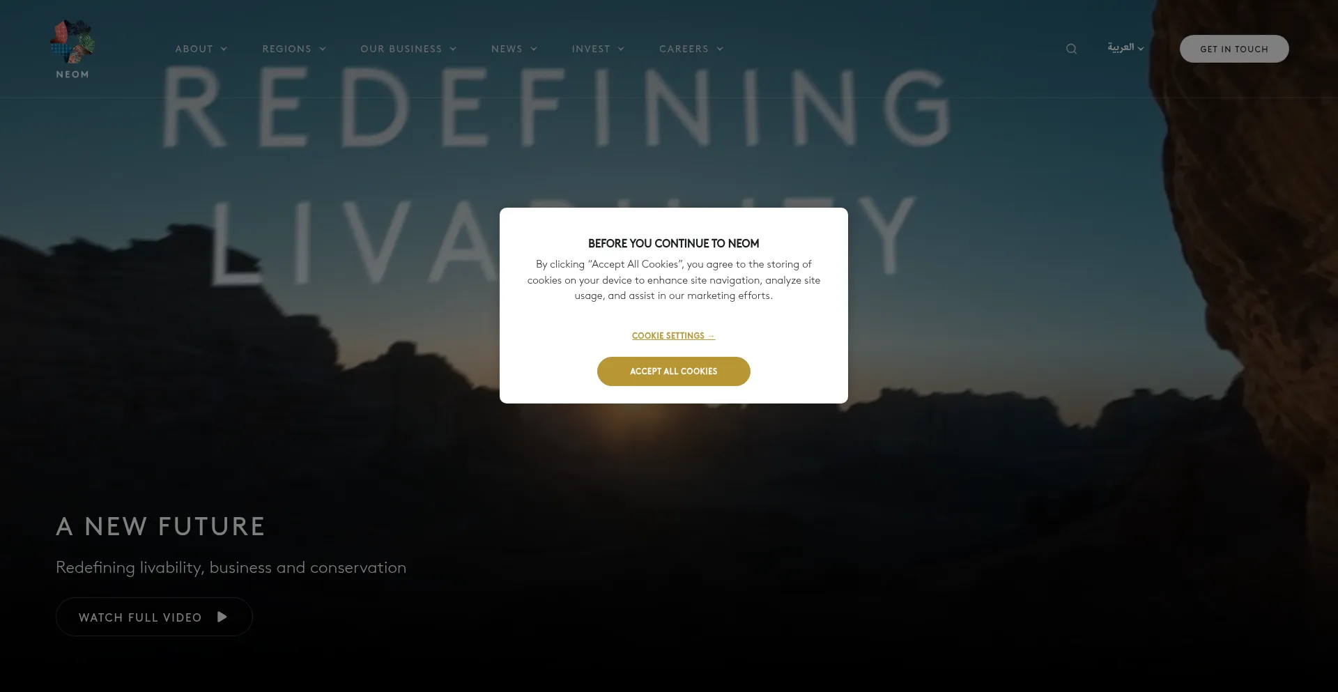 该网站实现符合GDPR或CCPA等隐私法规的cookie同意机制。这表明 neom.com 遵守数据保护标准并为用户提供对个人数据收集实践的控制。