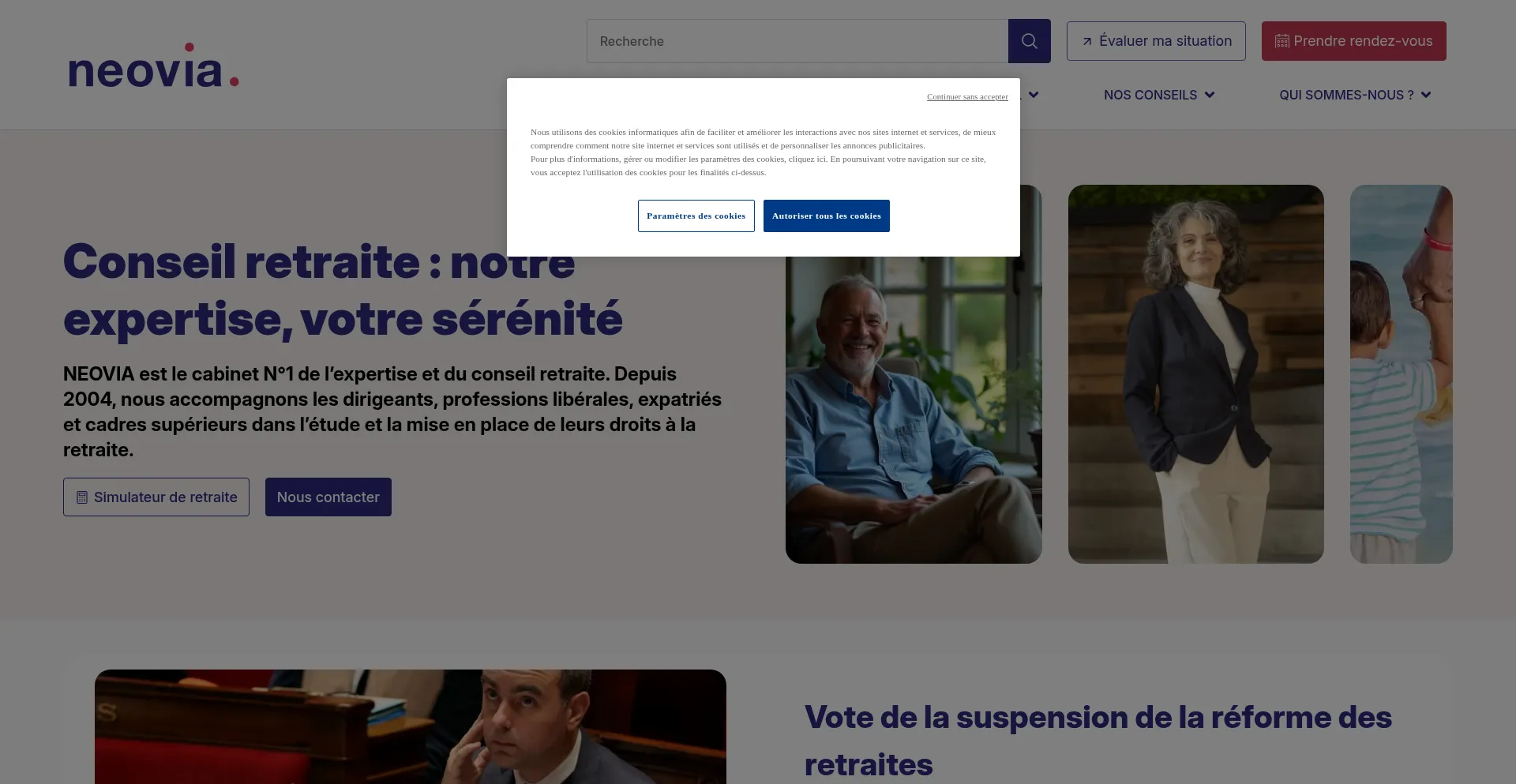 该网站实现符合GDPR或CCPA等隐私法规的cookie同意机制。这表明 neoviaretraite.fr 遵守数据保护标准并为用户提供对个人数据收集实践的控制。
