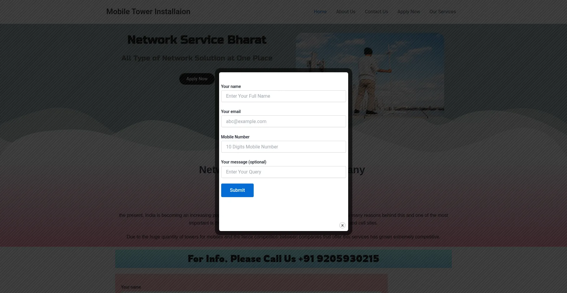 该网站实现数据收集表单,请求个人信息,包括姓名、电子邮件地址、电话号码或其他敏感详细信息。用户应验证 networkservicebharat.com 的合法性并在提交个人数据前查看隐私政策。