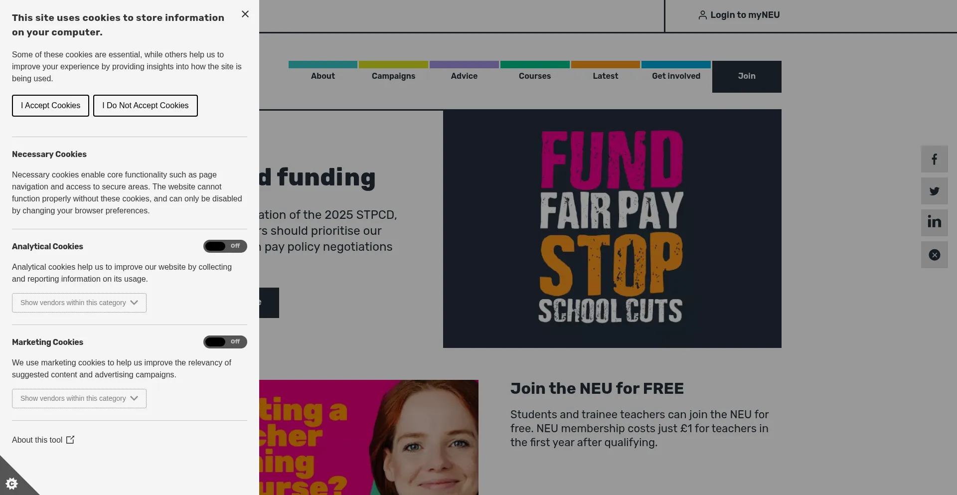 网站上存在社交媒体链接表明 neu.org.uk 在社交媒体上维护官方账户,这是可信度和参与度的积极信号。