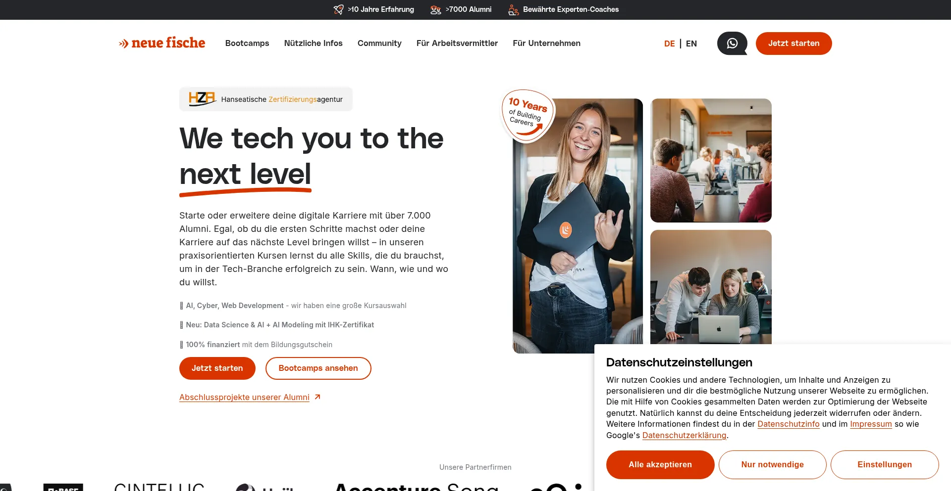 该网站实现数据收集表单,请求个人信息,包括姓名、电子邮件地址、电话号码或其他敏感详细信息。用户应验证 neuefische.de 的合法性并在提交个人数据前查看隐私政策。
