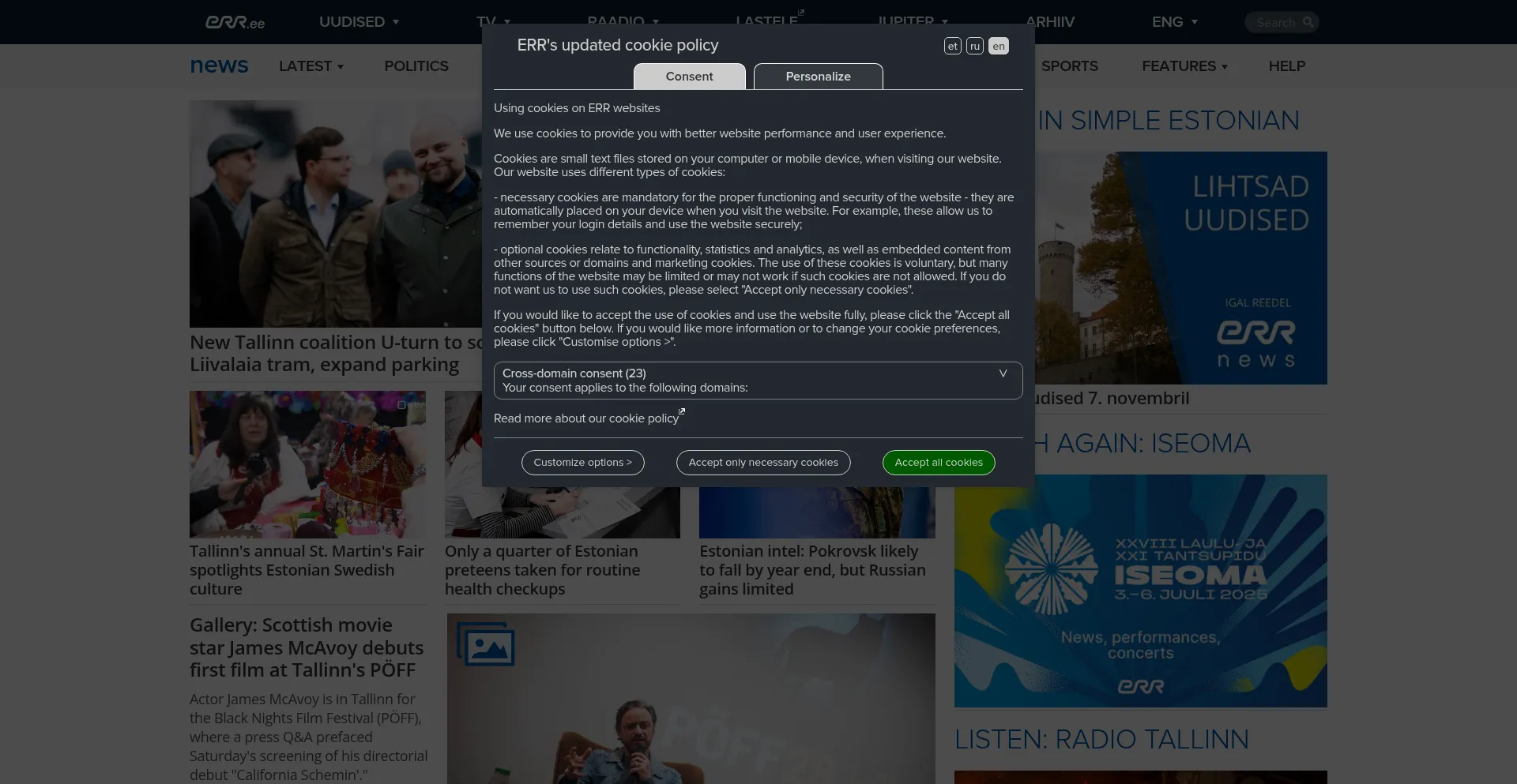 该网站实现符合GDPR或CCPA等隐私法规的cookie同意机制。这表明 news.err.ee 遵守数据保护标准并为用户提供对个人数据收集实践的控制。